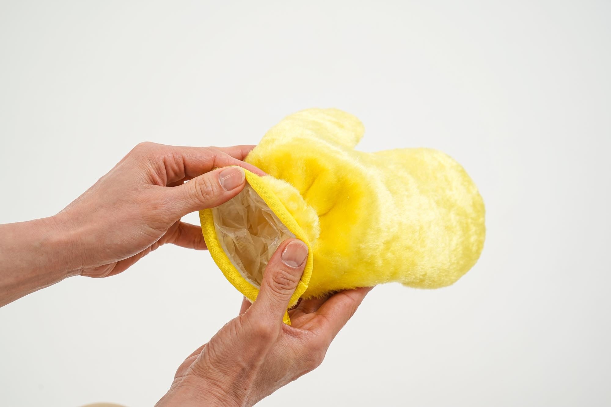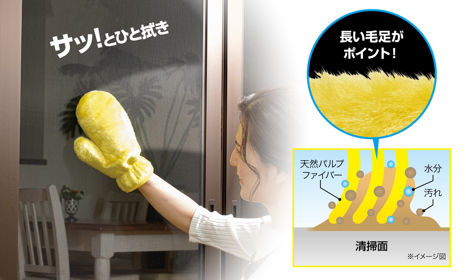 吸水性・吸油性のある極細繊維「天然パルプ」のミトン、洗剤不要で水に濡らしてなでるように拭くだけで、頑固な汚れや細かいホコリが長い毛足に絡まり、水分もサッと吸水してしっかりと拭き取ります。