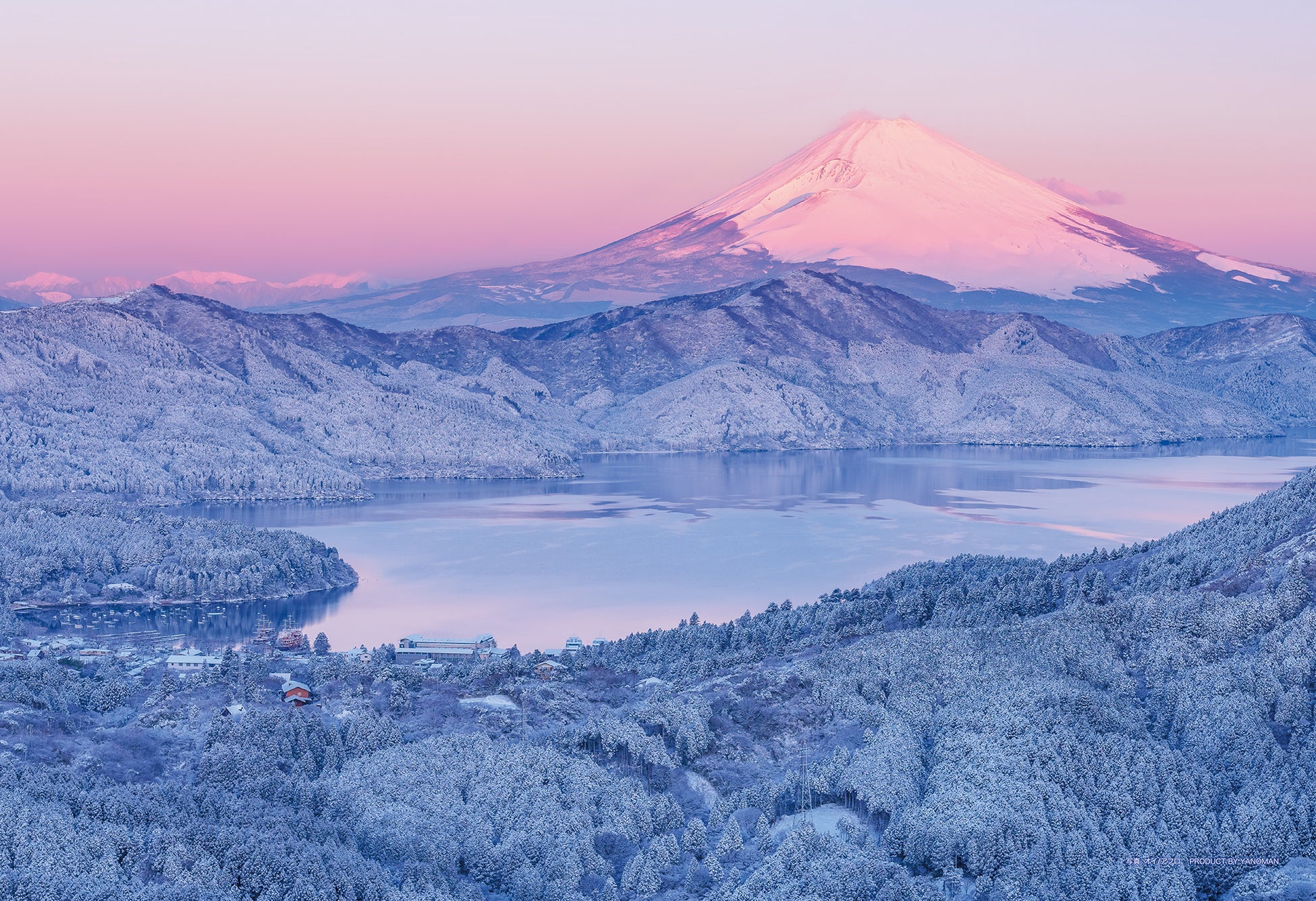 箱根大観山から望む、雪化粧をまとった富士山の絶景が広がる一枚。朝焼けに染まる空と白銀の山並みが織りなす幻想的な光景が、静かな時間を彩ります。朝の光に照らされた富士の頂は、神秘的で力強く、完成後はインテリアとしても映える作品です。