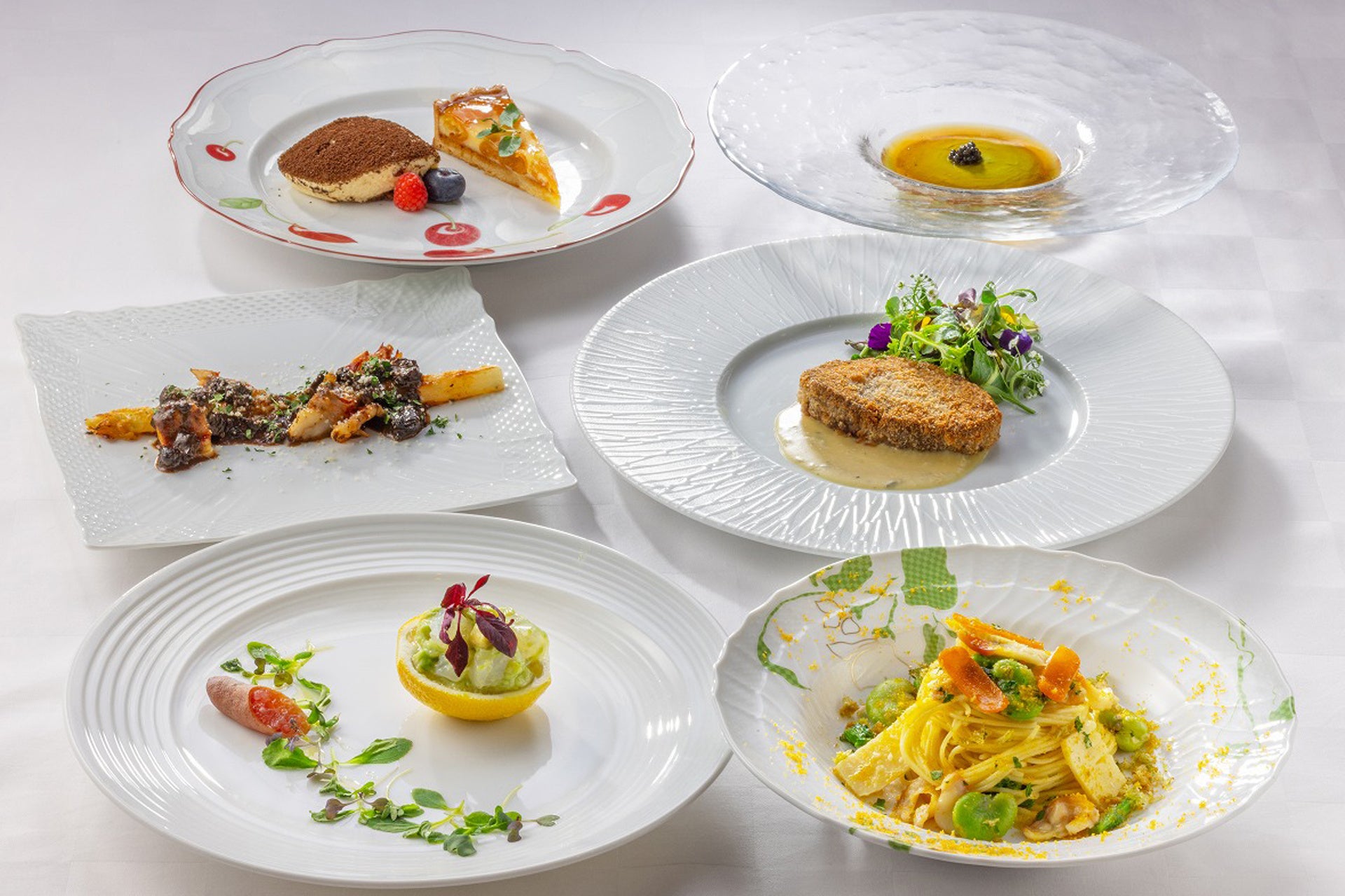 「真鯛のタルタル仕立て レモン詰め」「春野菜と北寄貝 からすみのスパゲティー」や「牛フィレ肉のカツレツ ゴルゴンゾーラソース」など、両シェフが考えた特別メニューを、ソムリエ厳選ワインとともにご堪能ください。