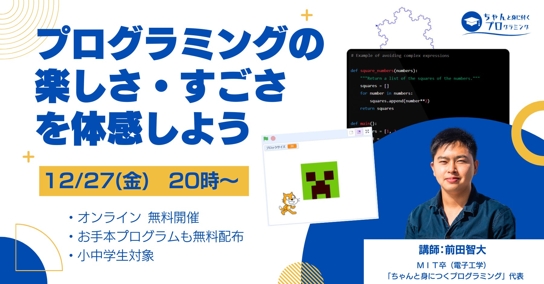 株式会社Mined(マインド|本社:東京都港区、代表取締役CEO:前田 智大、以下Mined)が運営する、「ちゃんと身につくプログラミング」(以下ちゃんプロ)の無料イベントを2024年12月27日(金) 20時に開催します。