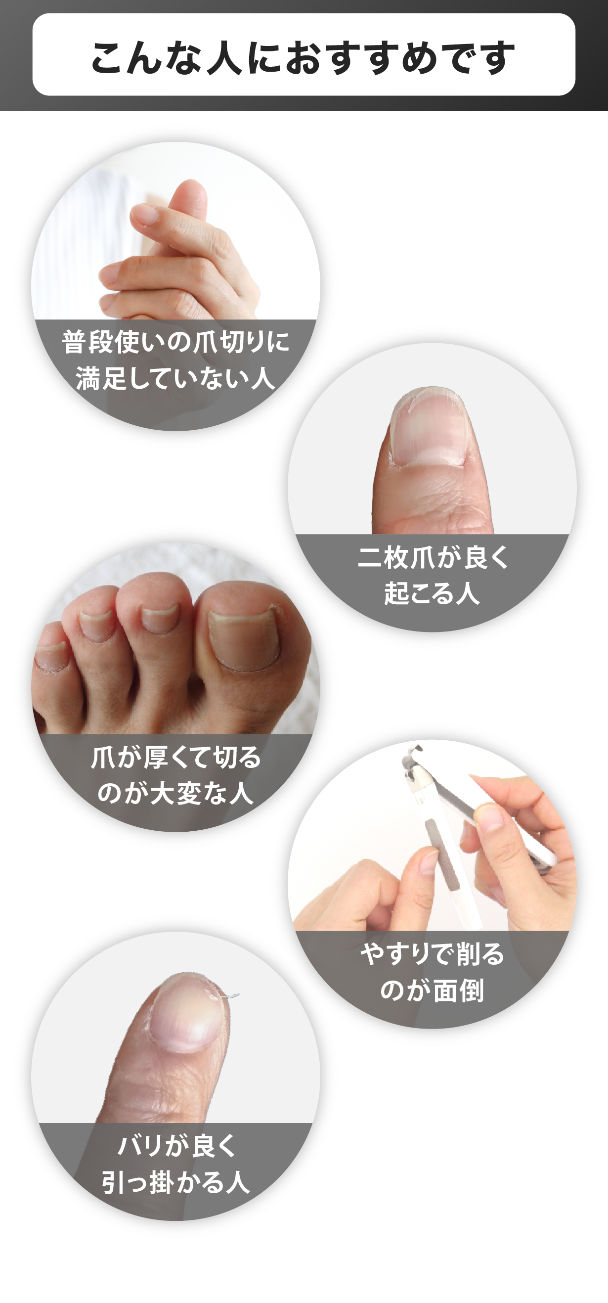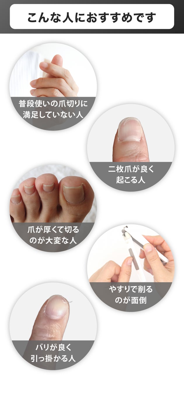 サクっと切れて割れにくい。鋭い刃は、極厚な爪でも簡単に切断します。