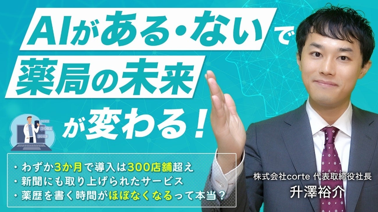 本説明会では、「新機能“AI音声入力”は薬局にどんな変化をもたらすのか。-AI導入で進化する薬局の未来-」と題し、「AI音声入力」を共同開発した、株式会社corte 代表取締役社長 升澤 裕介氏を講師に迎え、「AI音声入力」の活用方法と薬局にもたらす効果についてお話しします。