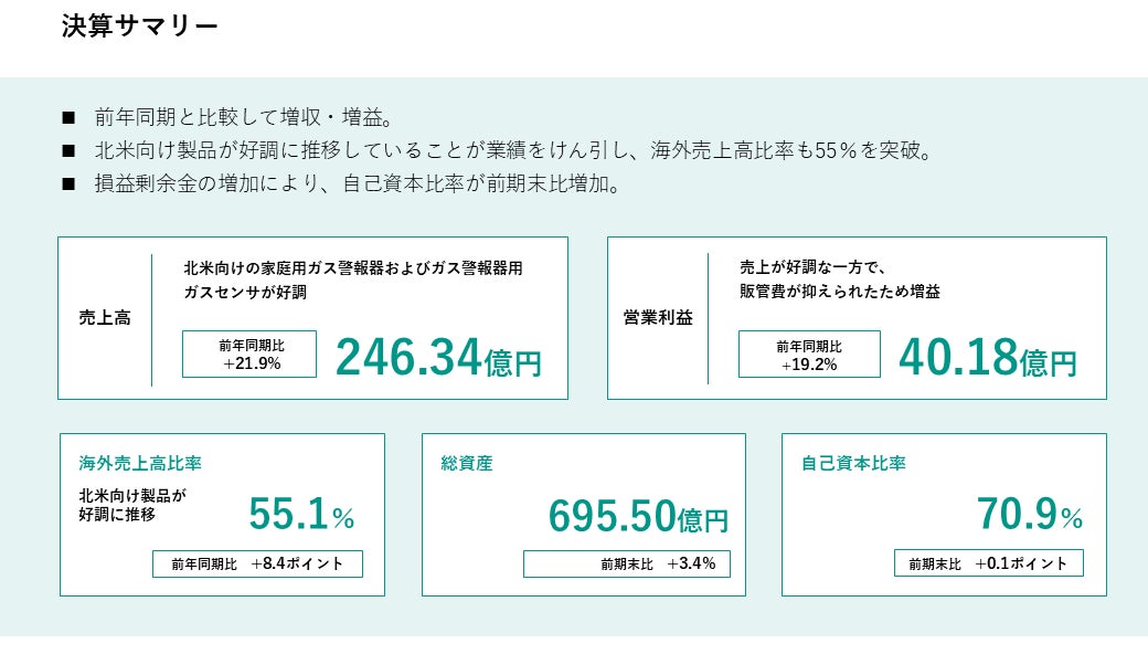 2026年3月期第2四半期については、北米向けの家庭用ガス警報器およびガス警報器用ガスセンサが好調に推移したことにより、売上高は前年同期比21.9%増の246億34百万円となりました。