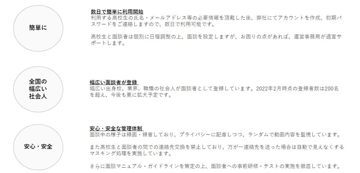 「オンライン進路相談プラットフォーム」は高校生が社会人に進路相談ができるオンラインプラットフォームです。高校生の興味・関心に沿った社会人と1対1で話すことで、自身のキャリアの視野を広げ、新しい「なりたい」や「やりたい」を見つけることを支援します。