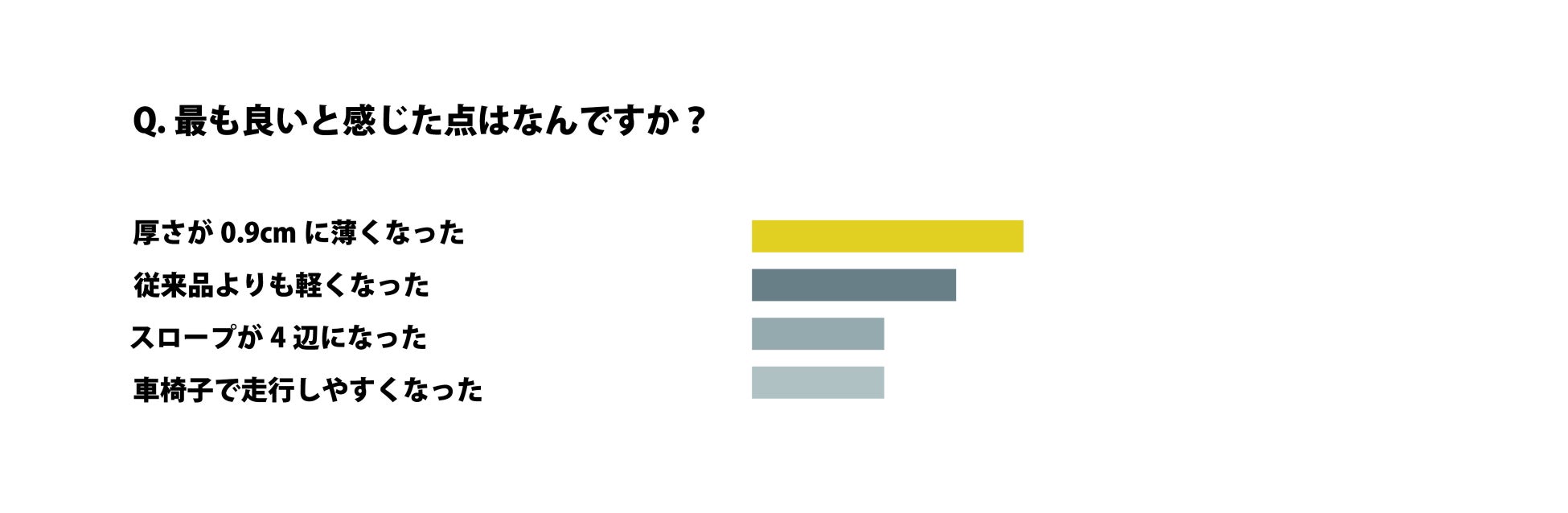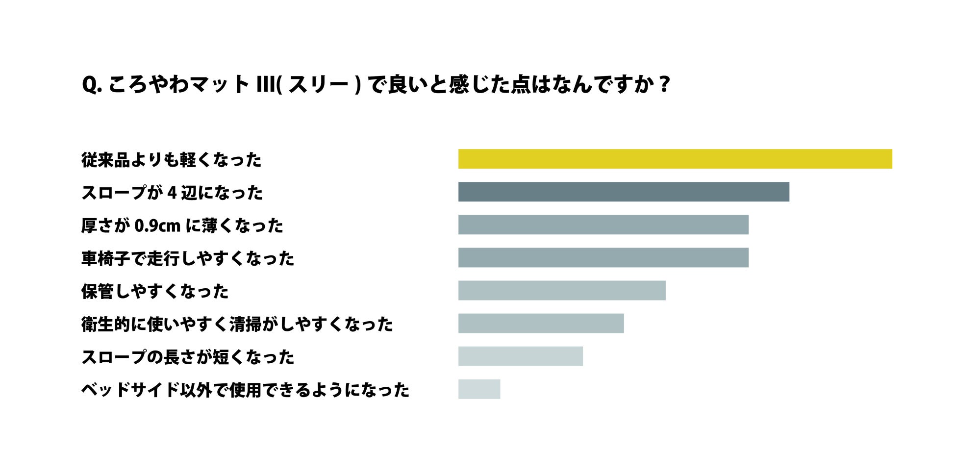 尚、先行モニターにご協力いただいた病院・介護施設11施設にて、『ころやわマットⅢ(スリー)』をお試しいただいたところ、現行品の評価を10点満点で5点とした場合、新製品『ころやわマットⅢ(スリー)』は平均8点という高評価をいただきました。また、回答者全員が「お奨めしたい」と評価いただいております。特に評価ポイントが高かったのは、「薄くなった」「軽くなった」「車椅子で走行しやすくなった」「スロープが4辺になった」という点で、さらに使いやすくなったころやわマットを医療・介護のプロが高く評価いただいております。