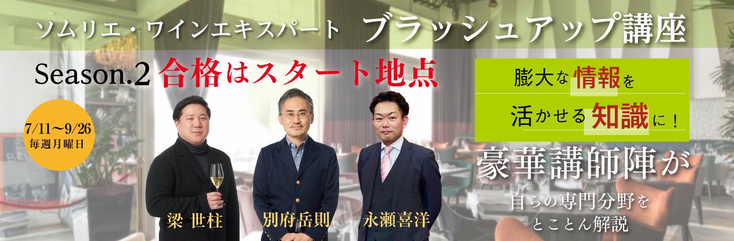 ※今講座では、ソムリエ・ワインエキスパート、WSETレベル2または同等レベルの資格保有者の方を対象に講座内容を設定しております。