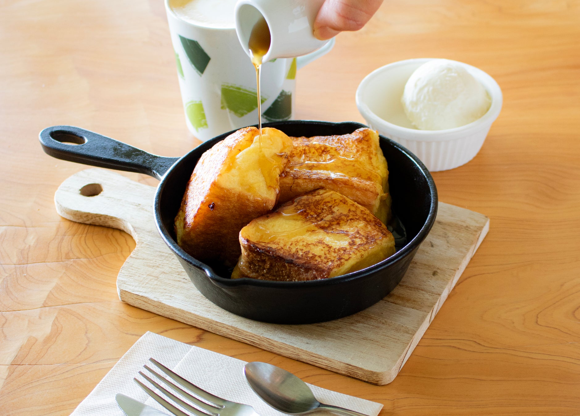 厚くカットしたたなびきを一晩卵液に漬け込み、注文が入ってからオーブンでふっくらと焼き上げます。お客様のお好みのタイミングでメープルシロップをかけてお召し上がりいただきます。スキレットに載せて提供する熱々のフレンチトーストと、別添の冷たいミルクジェラートとのコラボレーションをお楽しみください。〈期間限定販売〉