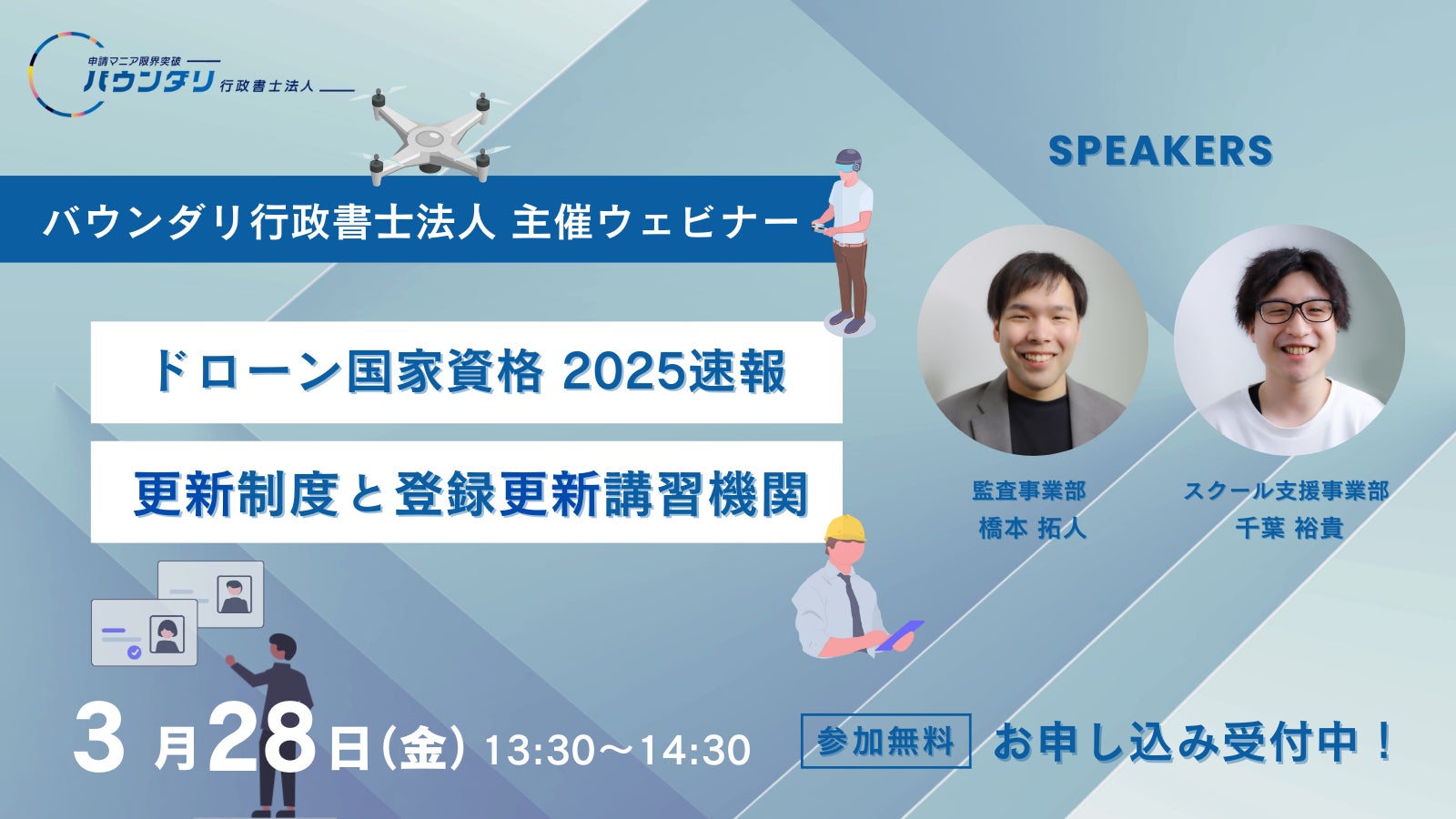 ドローンの関連許認可申請とソリューション開発を専門とするバウンダリ行政書士法人(本社:東京都千代田区、代表行政書士:佐々木 慎太郎)は、ドローン国家資格の「更新制度」と「登録更新講習機関」に関する無料ウェビナーを2025年3月28日(金)に開催いたします。