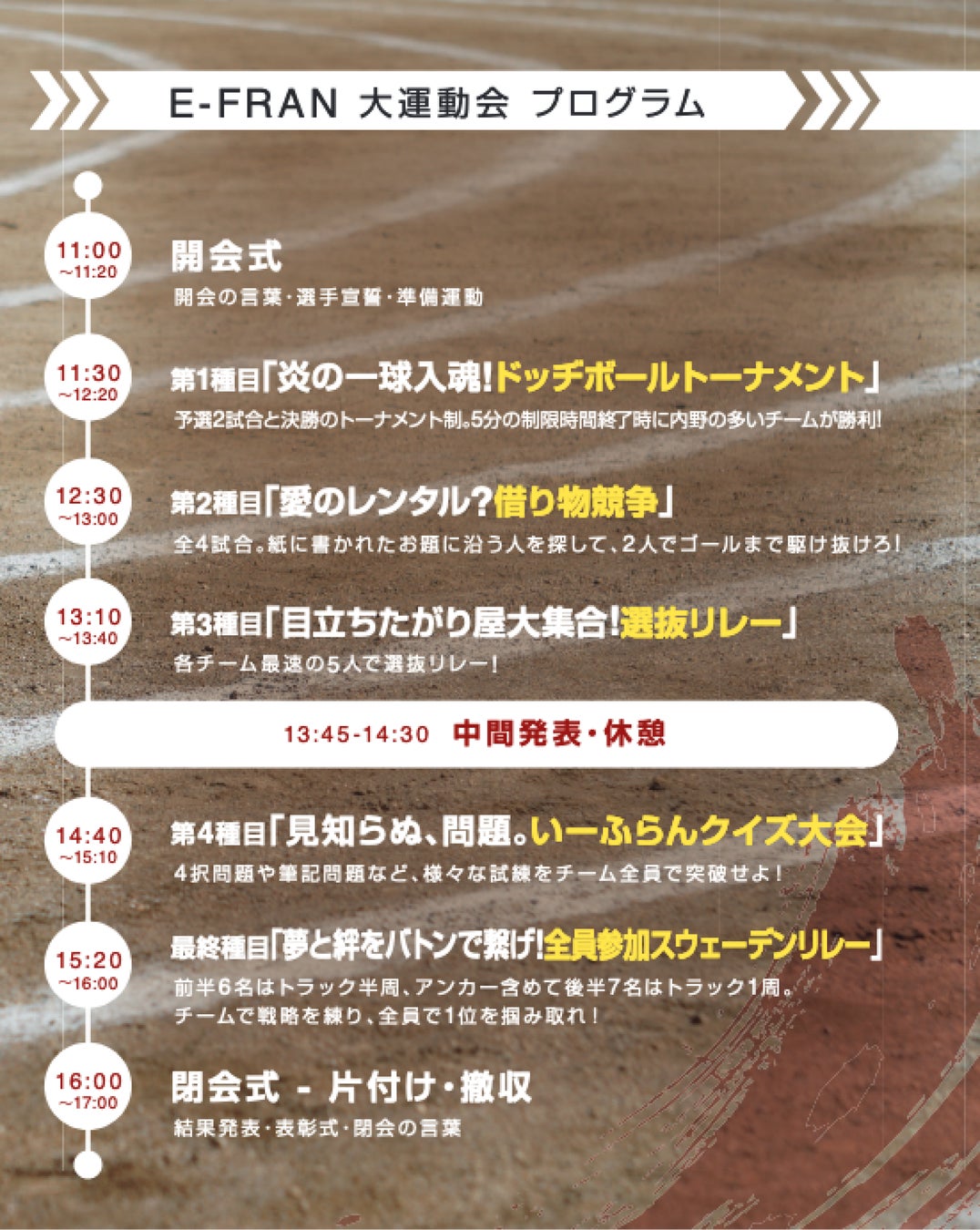 いーふらんは、入社前から新卒内定者がリラックスし、楽しく参加できるイベントを通じ、企業文化を体感できる場を提供し続けています。今回の秋の大運動会は24卒内定者たち自身で考え、社員と協力し合いながら実施いたしました。これはいーふらんが大切にしている勝ちにこだわる・仲間とともに成長し続ける精神を体現する機会と捉えております。