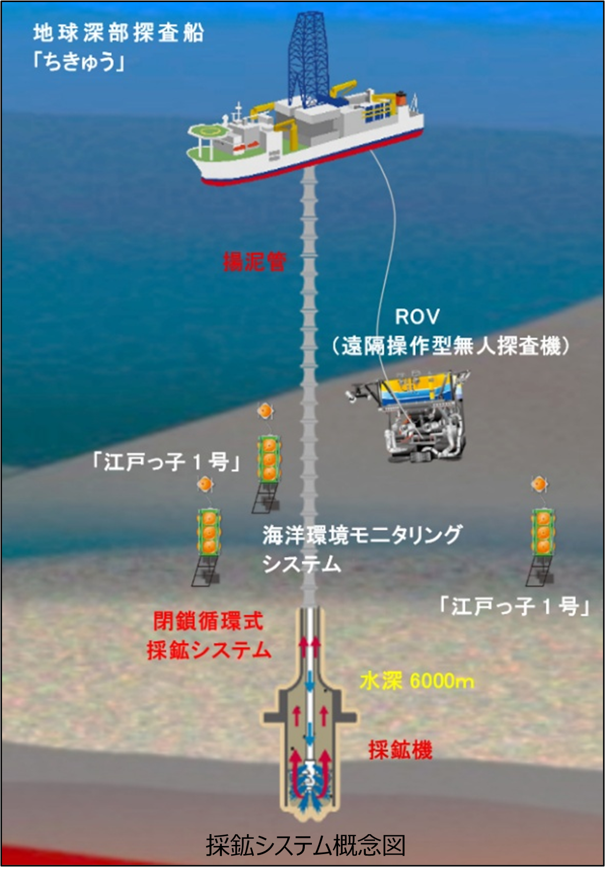 内閣府の「戦略的イノベーション創造プログラム(SIP)」の海洋課題が重点を置く海洋レアアース資源採鉱に向け2026年1月12日「ちきゅう」は清水港を出港し、南鳥島沖の試験海域へ向かいました。本試験では、船上から水深6,000mの海底へ揚泥管を降下させ、ROVで解泥・採鉱機を操作して船上へ泥を揚げる世界初の採鉱システム接続試験に挑みます。