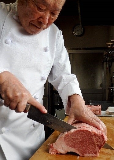 ステーキ肉は、若狭牛の中でも美味のお墨付きである「三つ星若狭牛」。厨房の冷蔵庫には重さ6~10キロほどあるヒレの枝肉が常時7~10本ほど横たわっている。「肉質の等級でいうとA5ランク。うちはA5のヒレしか扱わん」と語るのはシェフの竹内二三さん(75)。開店から52年、厨房を預かるベテラン調理人で、春之助さんの末弟であり、博之社長の叔父に当たる。牛肉の見極め、焼き、味付けとステーキに関しては、博之社長も二三さんに全服の信頼を置く。