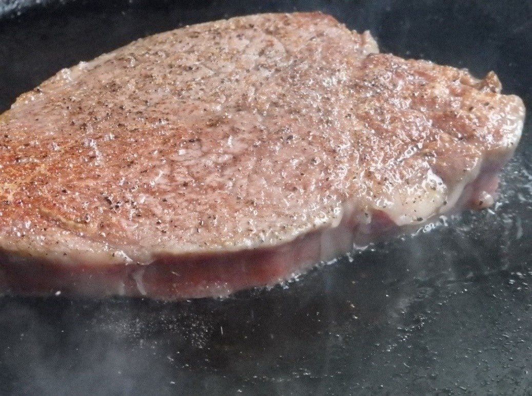 ジュゥウウ~と、黒光りしたフライパンの上で脂が跳ねる。コンロ前で腰に手をやり、じっと音を聞き分ける二三さんは、まさに熟練のステーキ職人という立ち姿。