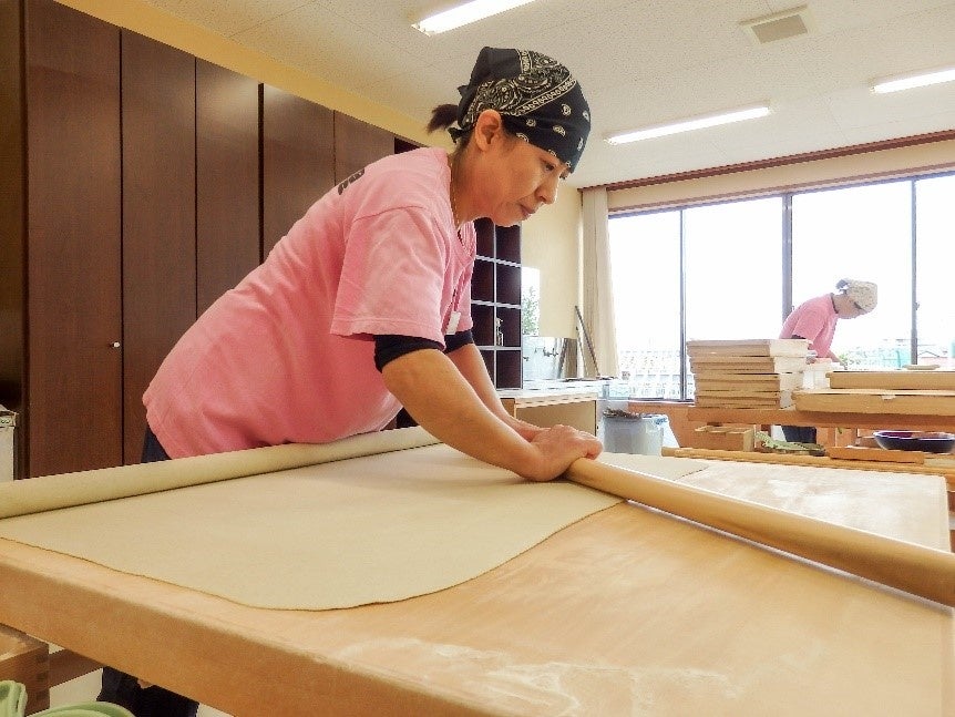 開店2時間半前の朝8時半。茶屋の2階では、店長の辰巳真由美さんら女性スタッフによるそば打ちが始まる。のし棒を巧みに操り、練ったそば粉を平らに延ばしていく。厚み2ミリ以下にまで延ばす動きは2人とも手際よく、打ちの所作が美しい。「毎日2人で120食ほどのそばを打ちます。古城まつりなどの催事がある時は、300~400食ほど打っているかな」と辰巳さん。福井のそば店は、男主人がそばを打つのがごく普通だが、この店の打ち手は女性ばかり。3人とも地元の丸岡そば振興協議会認定の有段者で、「女性ならではの繊細なそばの持ち味」がこの店の売りと言っていい。