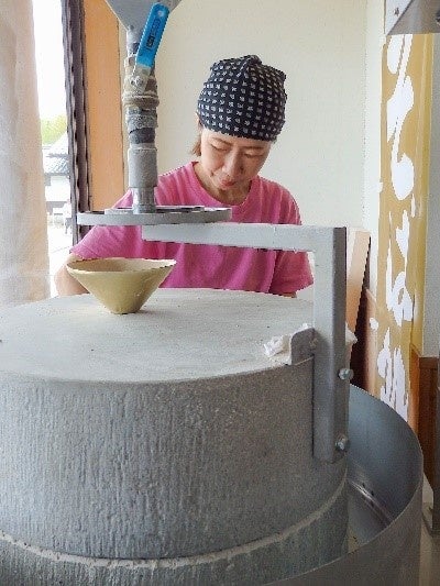 こだわりは全メニューに丸岡産のそばを使っていること。町内の栽培農家から仕入れたそばの実を石臼を使って挽くことで、香り良い、ほんのり青緑がかったそば粉につながる。「私も、よそのそば屋さんに行くことはあるけど、丸岡産のそばと口当たり、弾力が違う。あぁ、やっぱり丸岡産が一番だと実感するの」。そば打ち歴11年の辰巳さんも丸岡産にほれ込む。