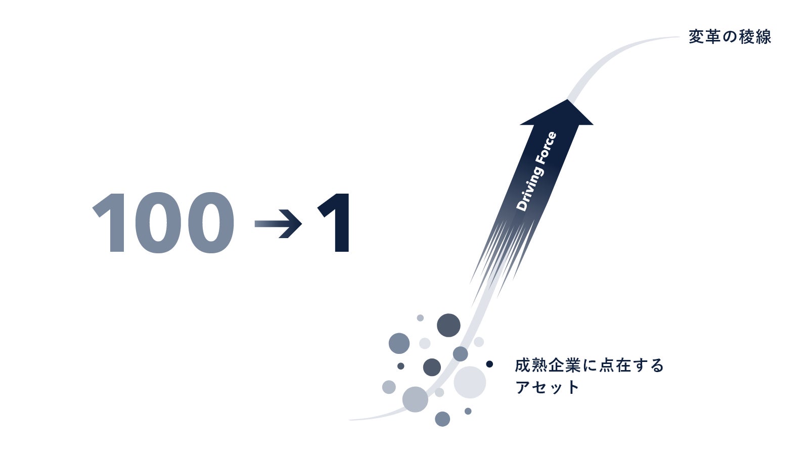 Creative Hubは、そうした成熟企業に求められるCoE(センター・オブ・エクセレンス)型の組織運営やDX(デジタルトランスフォーメーション)といった部門横断型の全社変革に対して、変革に新たな推進力をもたらすクリエイティブ・コンサルティングを提供します。成熟企業に点在するアセット=“100”から、変革を乗り越える強い推進力(Driving Force)=“1”を創造することで、「人起点」による全社的な変革「Human∞Transformation」を加速させてまいります。