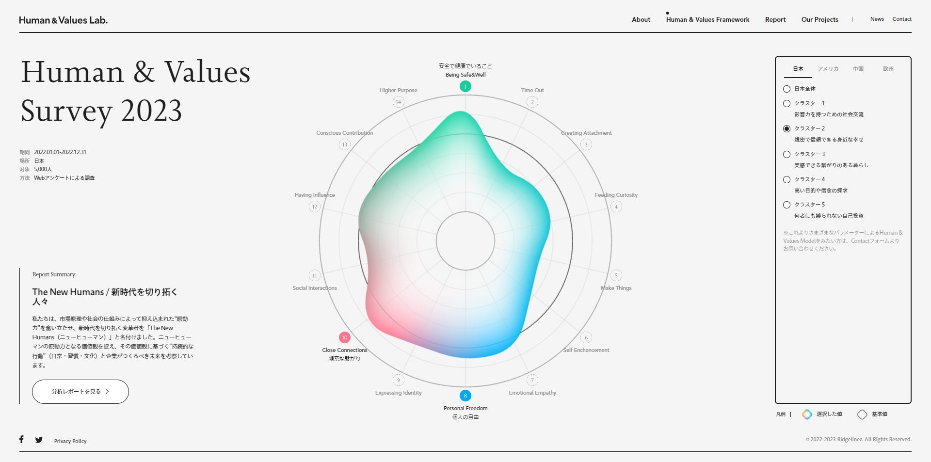 また、Creative Hubが主導する「Human & Values Lab.®」では、人の原動力となる多様な価値観と行動の関係性を科学的に捉える研究を行っており、そこで得られた「人」に関する最新の知見・データを活用した、人起点の価値創造を実現するコンサルティングサービスを提供しています。