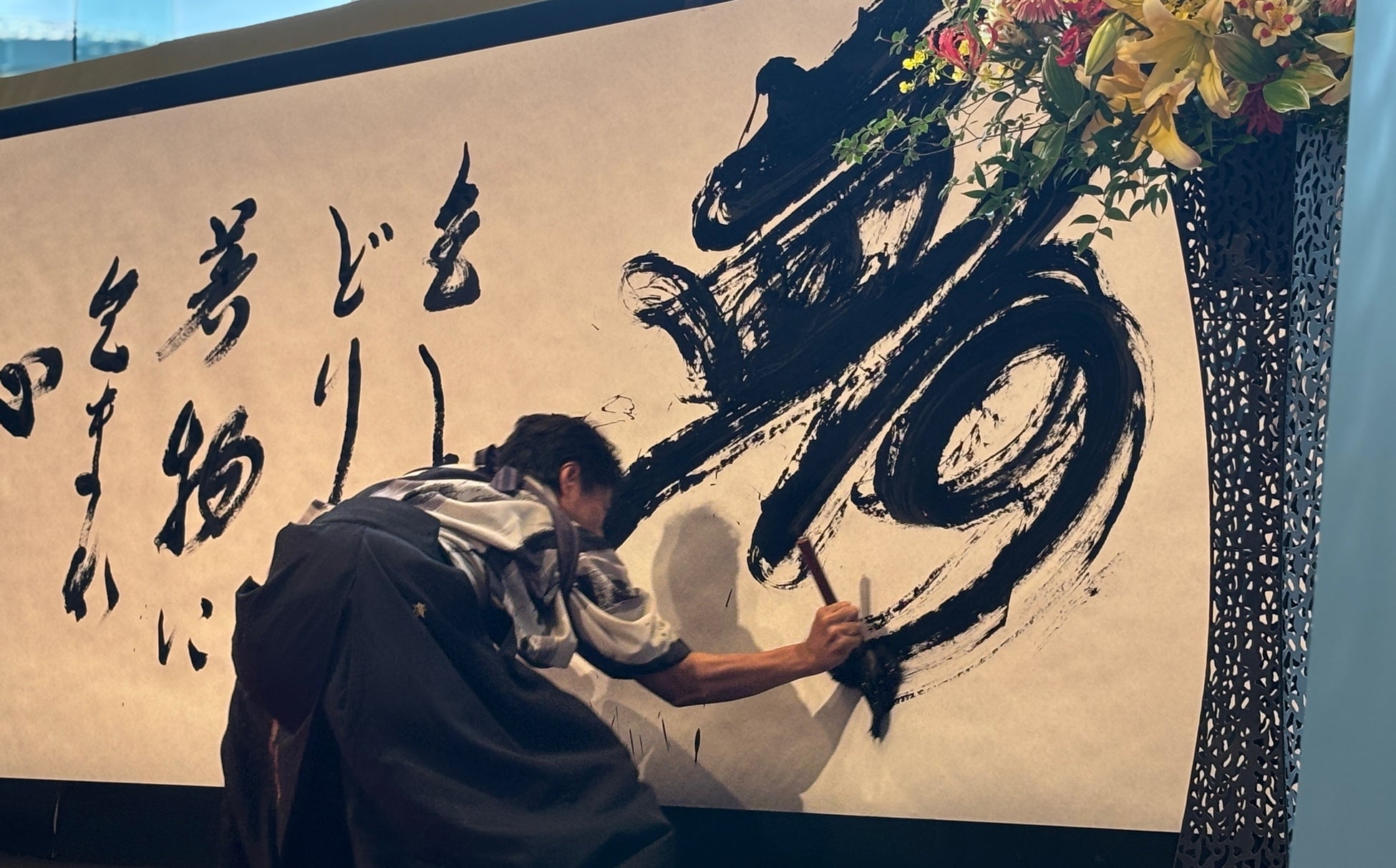 オープニングは国内外で活躍する書家・杉田曠機(こうき)さんが登場し、圧巻のパフォーマンスで「夢」をダイナミックに表現。書道という、きものと同じ日本の伝統文化で観客を魅了して遊々会はスタートしました。