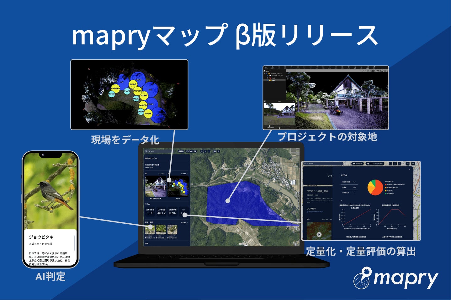 「mapryマップ」は現場のリアルなデータを使って、自然関連プロジェクトとして自然共生サイト・Jクレジットや様々な地域活動の取り組みの効果を定量評価を公開することができるWebアプリケーションサービスです。