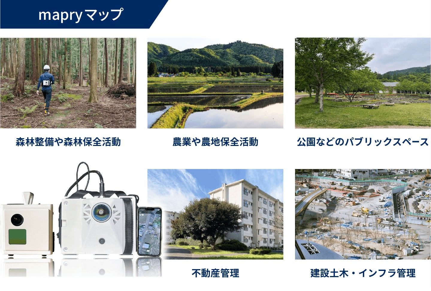 マプリィは測量・林業・防災・農業・建設に関わる全ての方向けのサービスです。これまで測量機器費用負担や機器操作/解析が難しく、ハードルの高かった三次元データなどの取得、解析や活用を容易に行えるソリューションを提供しています。