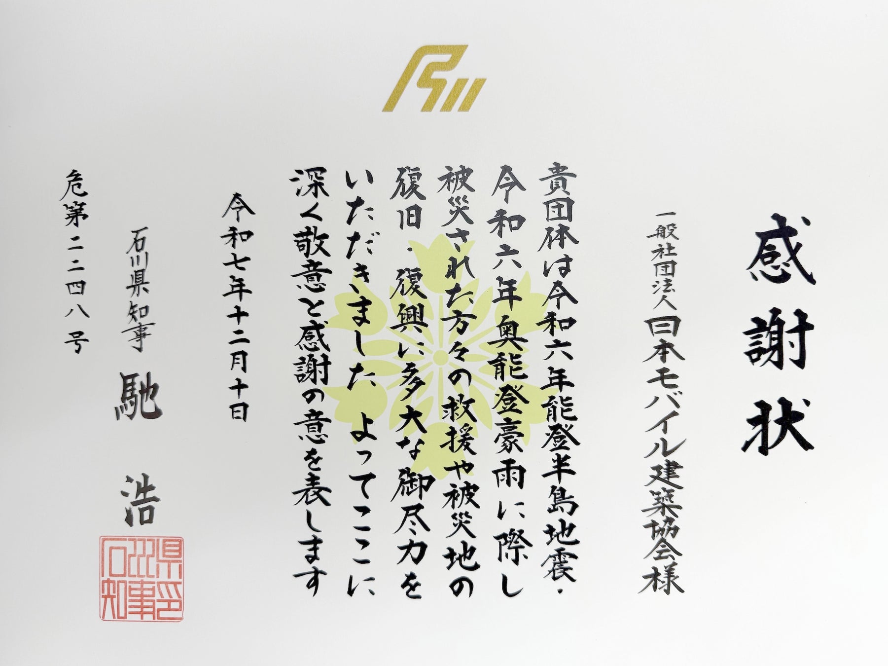 このたび、一般社団法人日本モバイル建築協会(本部:東京都千代田区、代表理事:長坂俊成)は、『石川県主催の令和6年能登半島地震・令和6年奥能登豪雨 知事感謝状贈呈式』において、石川県知事から感謝状を授与されました。