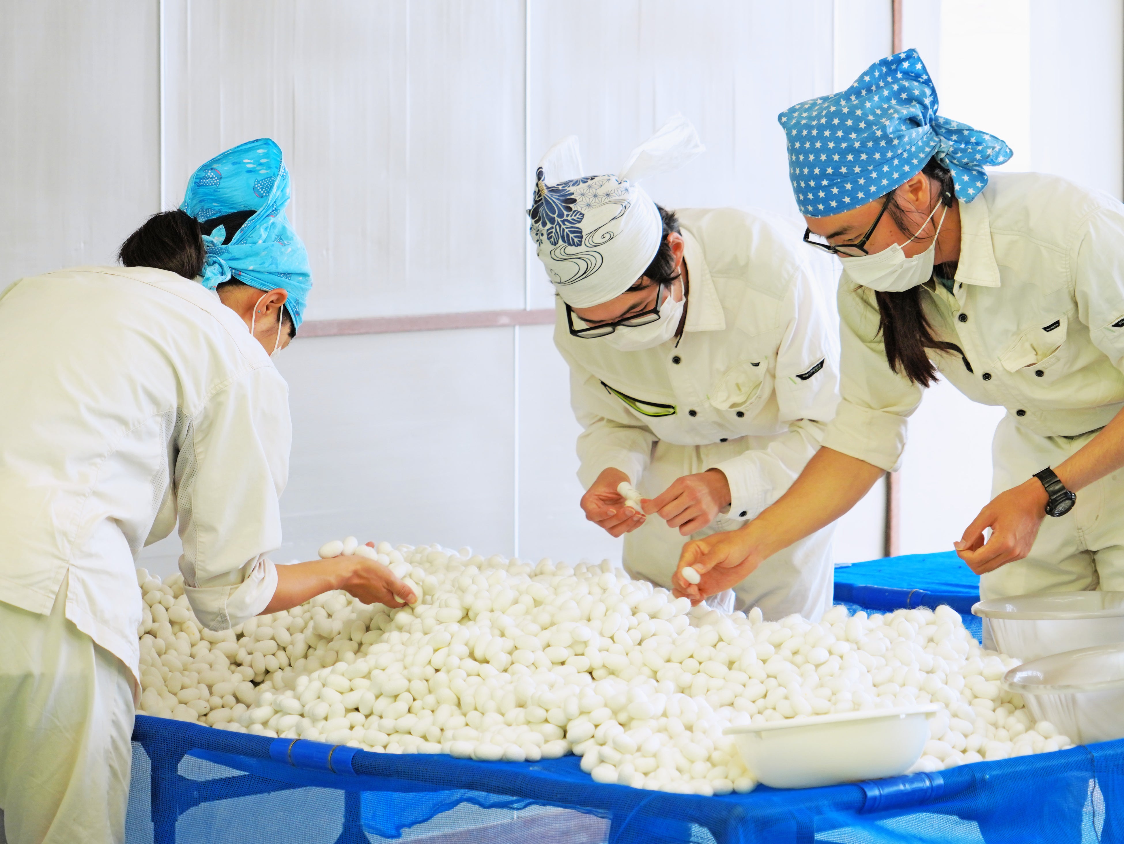 また、生産した繭は細かい違いに気づくことが得意な社員の特性を活かし、良質な繭のみを目視で選別、品質向上の維持に努めています。※蚕は●頭と数えます。