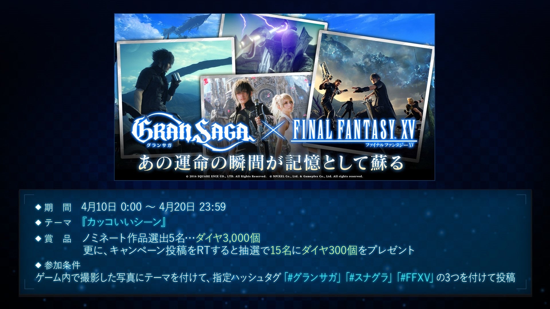 株式会社NPIXELが提供するクロスプラットフォーム対応の王道RPG 「グランサガ(Gran Saga)」(運営:株式会社GAMEPLEX)の公式Twitterにて、4月10日より「ファイナルファンタジーXV」とのコラボを記念した「グランサガスナップ写真コンテスト」を開催いたしました!