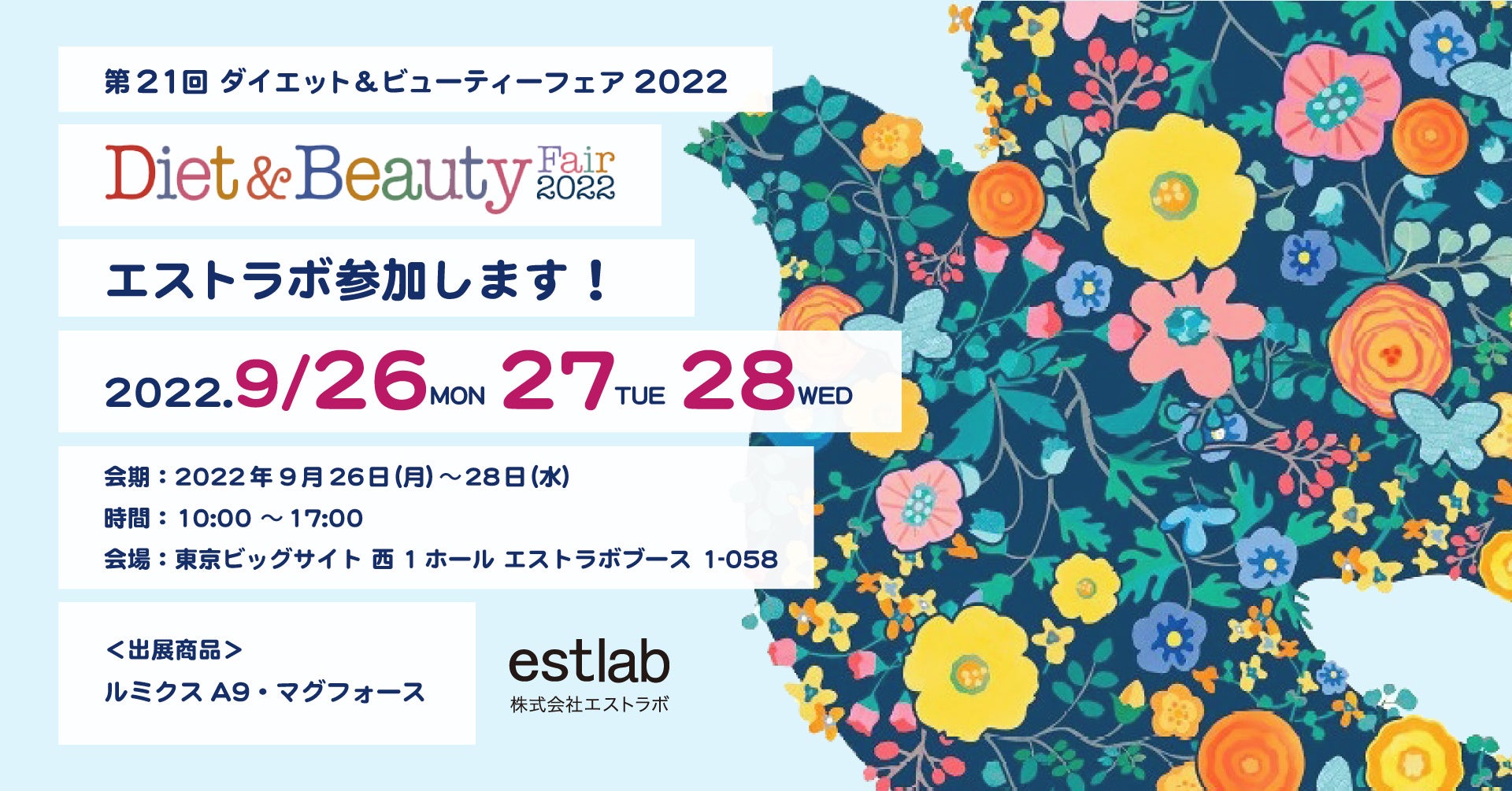 すべての人に「美」と「健康」の提供を目指し、化粧品や美容機器を製造・販売する株式会社エストラボ(本社:東京都新宿区、代表取締役社長:久保瞳)は、さまざまな美容・健康業界のプロが集結するビジネス展示会『ダイエット&ビューティーフェア2022』に出展いたします。