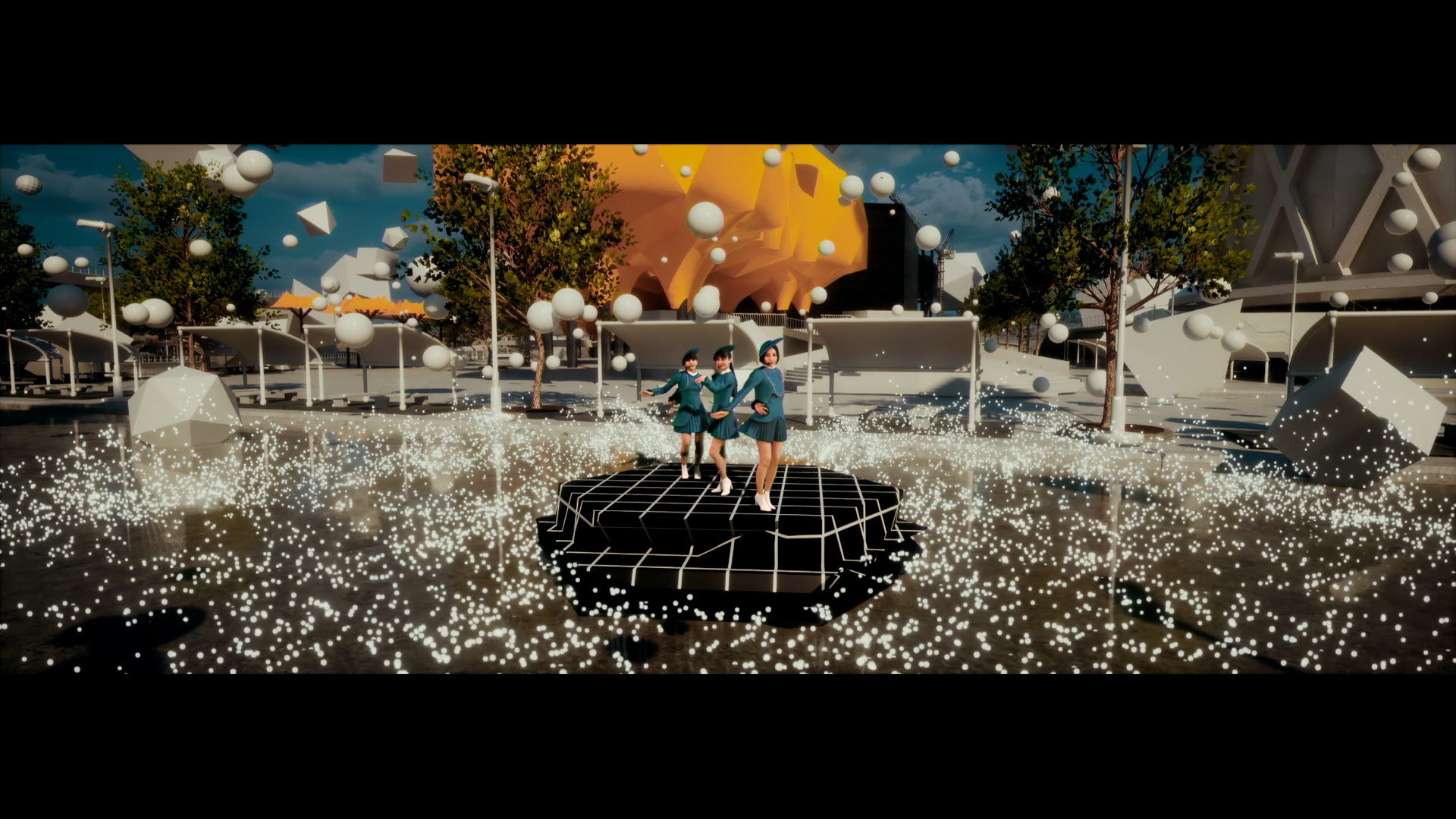 Perfumeが吹田の特設ステージと夢洲のNTTパビリオン、さらにはバーチャルで再現する1970年の大阪万博会場を行き来する演出となっており、Immersive LED Systemには、視点を自在に変えられる三次元点群データ、4視点の3D実写映像、バーチャル空間の3DプリレンダリングCGというPerfumeの動きを届ける3種類の情報を交互に切り替えて表出しました。異なる3つの映像が、等しく傑出した立体感と奥行き感を持ち、シームレスにつながった一つの世界として違和感なく楽しめるよう、各チームと連携し繊細な3D効果の調整も行いました。