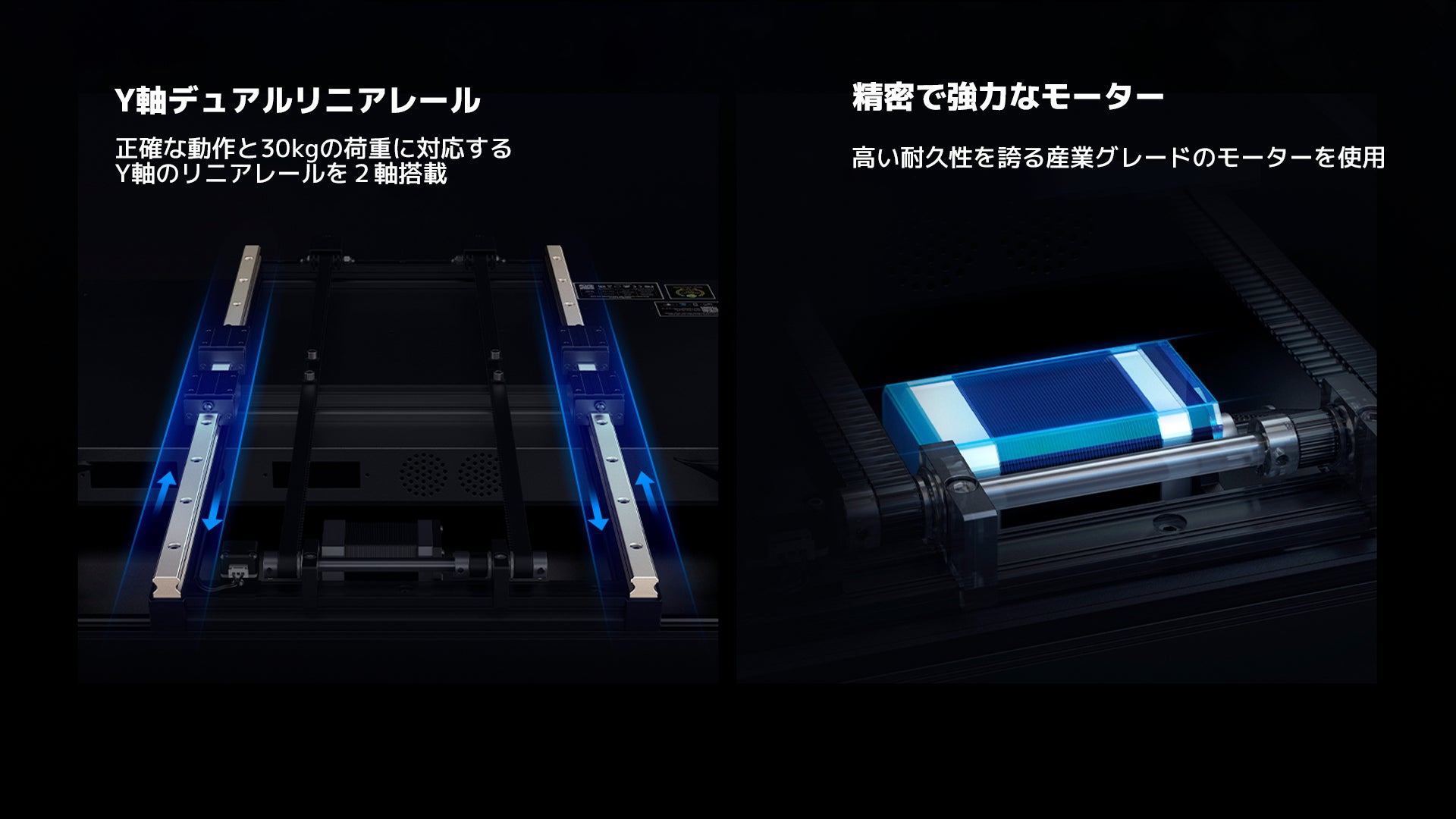 Y軸のデュアルリニアレールは、正確な動作と30kgの荷重に対応。