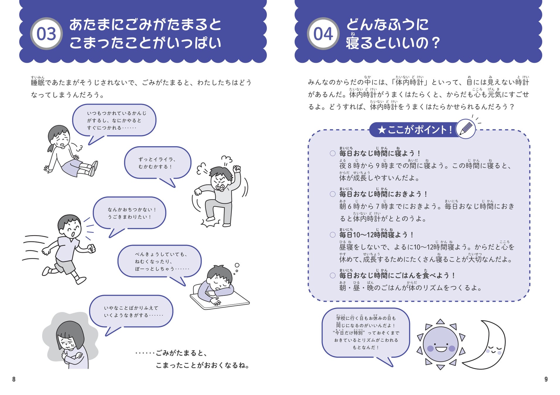 本ハンドブックは、その「みんいく」を学年に応じて必要な知識を段階的に学ぶことができ、豊富なイラストや図解、写真などで視覚的にも分かりやすい副教材となっています。著者が10年以上にわたる睡眠教育の実践で培った、独自のデータや子どもの生の声が満載!また、厚生労働省が発行の「健康づくりのための睡眠ガイド 2023」をはじめ、最新の睡眠教育の知見を網羅しています。