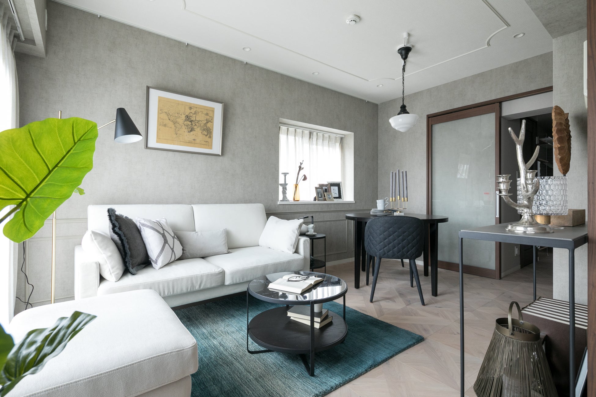 内装やインテリアはInstagramを参考に、生活感を感じさせない海外っぽい雰囲気に。ライティングレールは照明の位置を変えられるだけではなく、グリーンを飾るためのツールにし、さりげなく個性的な空間を演出。