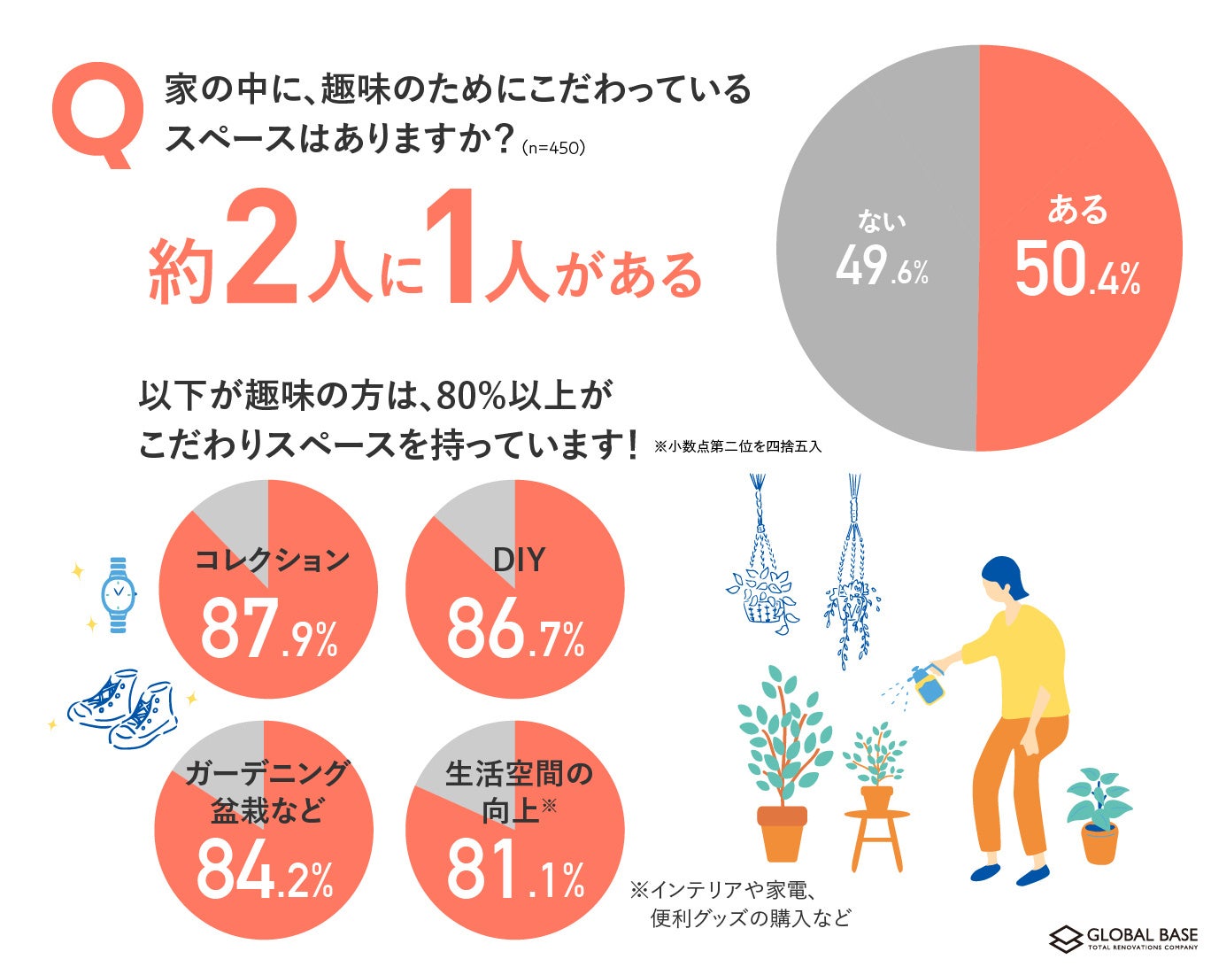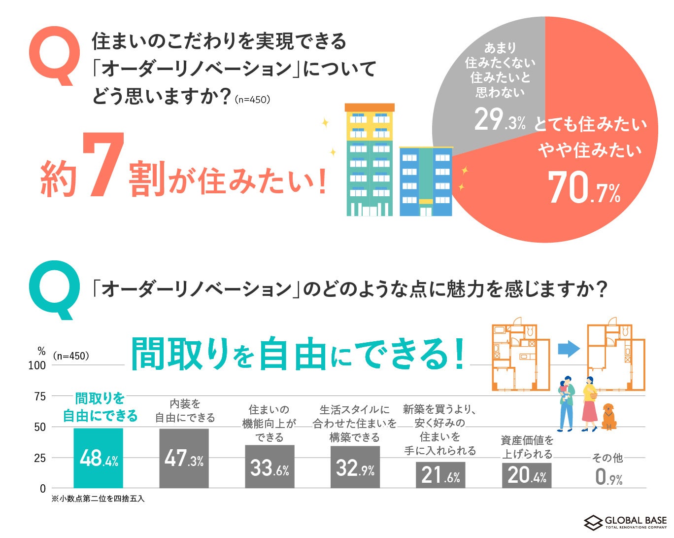 関東・関西の都市部で高品質なリノベーションマンションを提供するグローバルベイス株式会社(本社:東京都渋谷区、代表取締役社長:茂木敬一郎、以下、「グローバルベイス」)は、東京23区内にお住まいの世帯年収600~1,000万円のミドル層の20~40代男女450名を対象に「住まいのこだわりに関する調査」を実施しました。