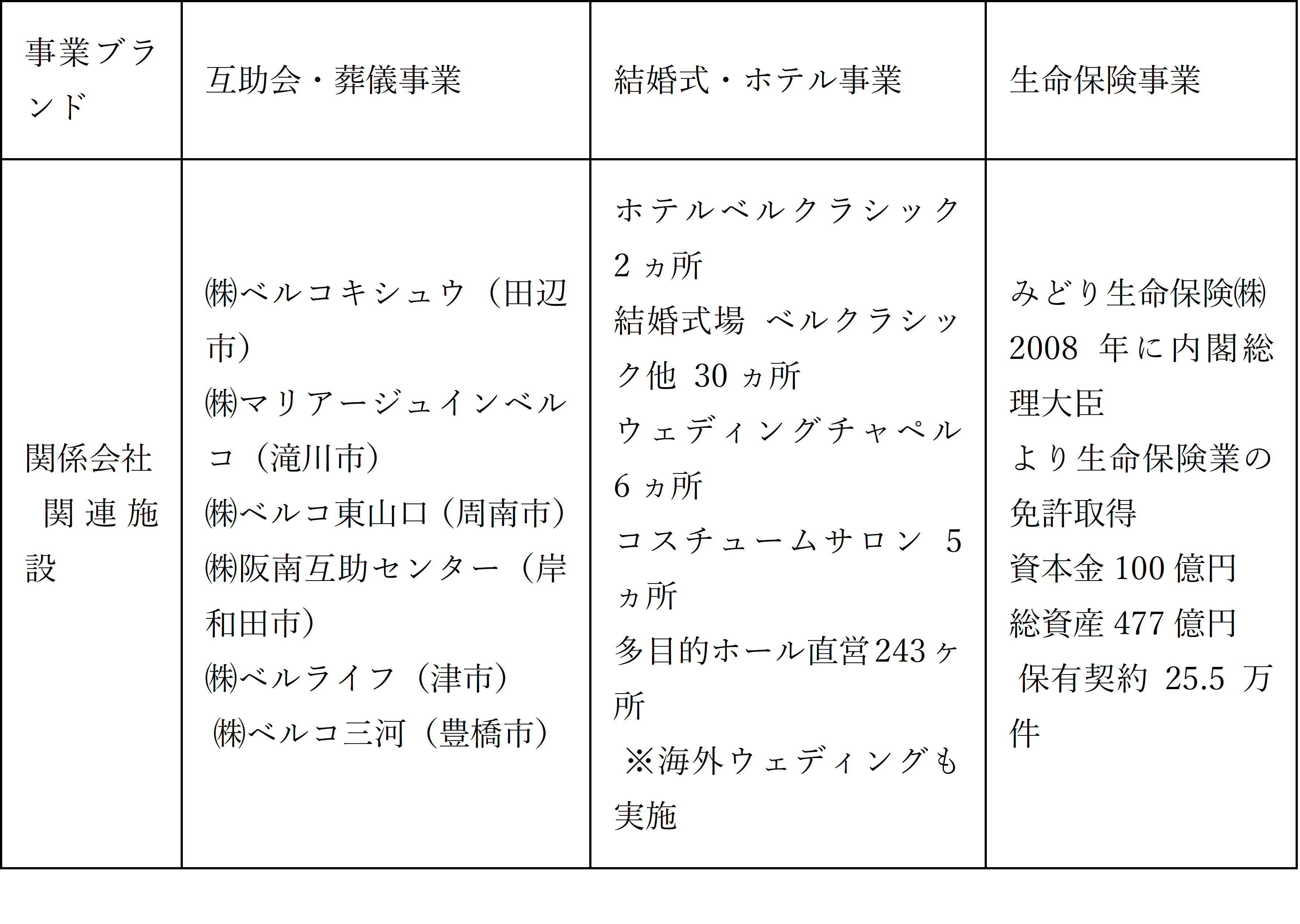 関係会社 関連施設 | ㈱ベルコキシュウ(田辺市) ㈱マリアージュインベルコ(滝川市) ㈱ベルコ東山口(周南市) ㈱阪南互助センター(岸和田市) ㈱ベルライフ(津市) ㈱ベルコ三河(豊橋市) | ホテルベルクラシック 2ヵ所 結婚式場 ベルクラシック他 30ヵ所 ウェディングチャペル 6ヵ所 コスチュームサロン 5ヵ所 多目的ホール直営243ヶ所 ※海外ウェディングも実施 | みどり生命保険㈱ 2008年に内閣総理大臣 より生命保険業の免許取得 資本金100億円 総資産477億円 保有契約25.5万件 |