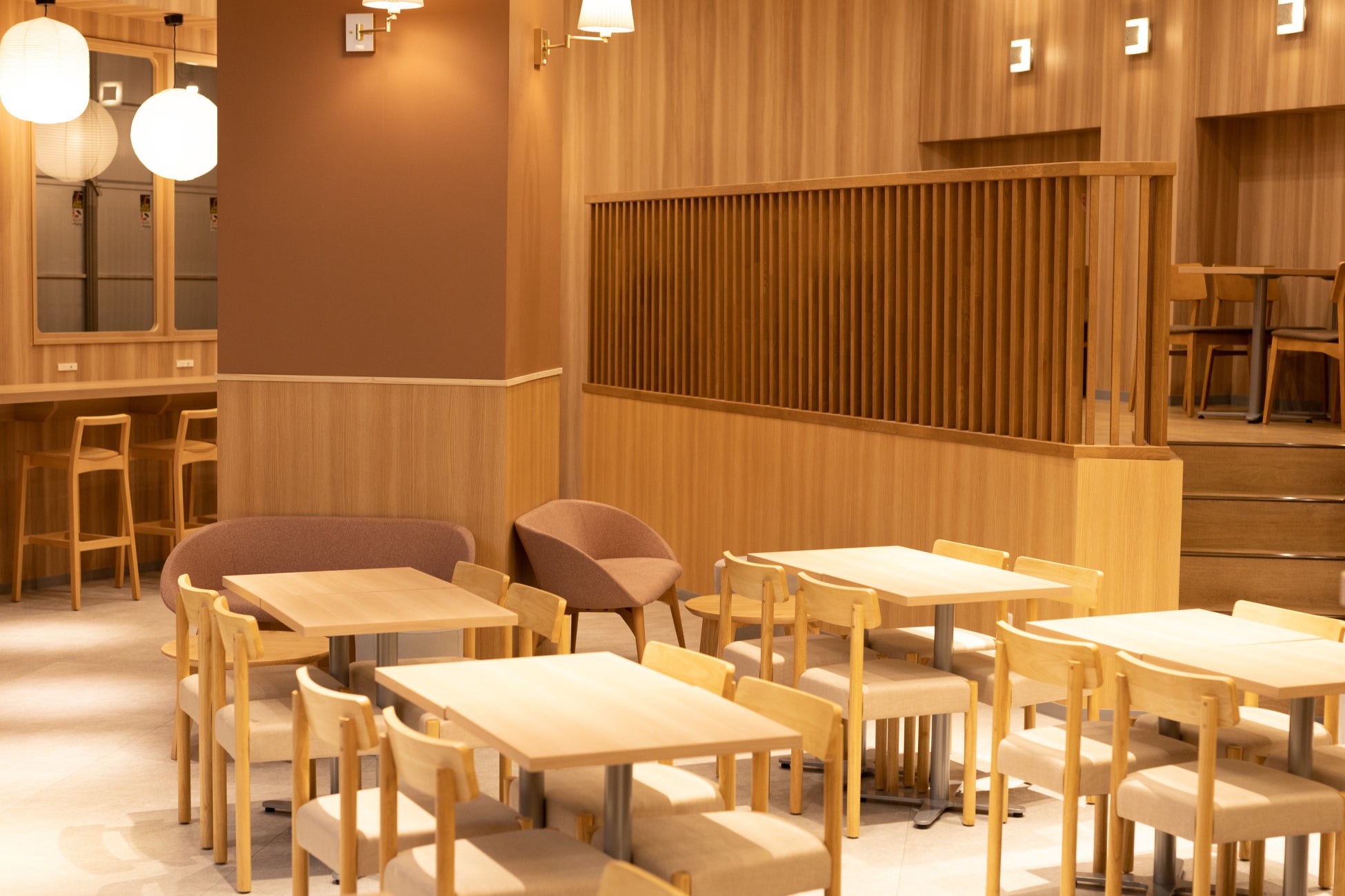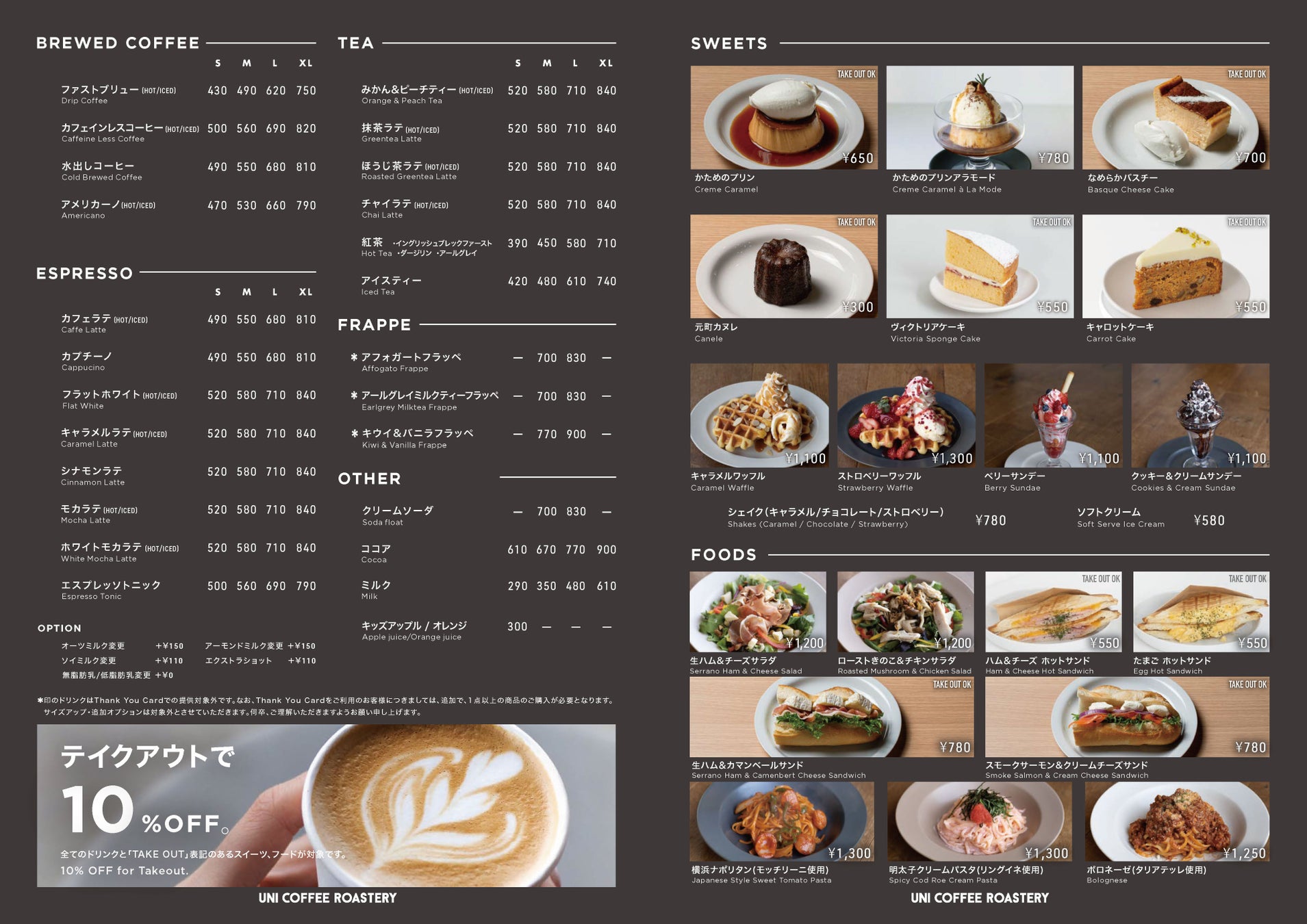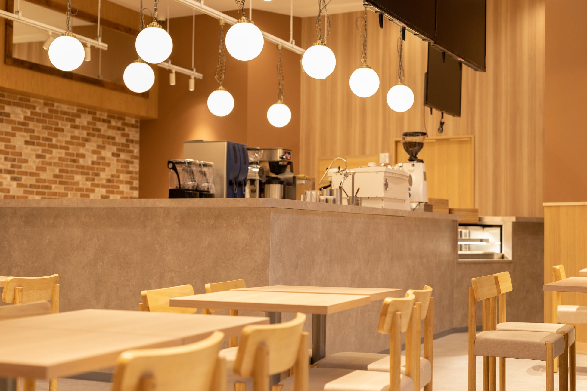 2Fの「UNI COFFEE ROASTERYららぽーと海老名」はブラウンを基調とした優しい色味を取り入れた内装に、全72席とUNI COFFEE ROASTERYブランドでも最大級のスペース、席数を用意しております。提供メニューは定番のドリンク類、カフェスイーツのほか、サラダやパスタ、サンドイッチなどもラインアップ。カフェからランチまで幅広いシーンでご利用いただけます。