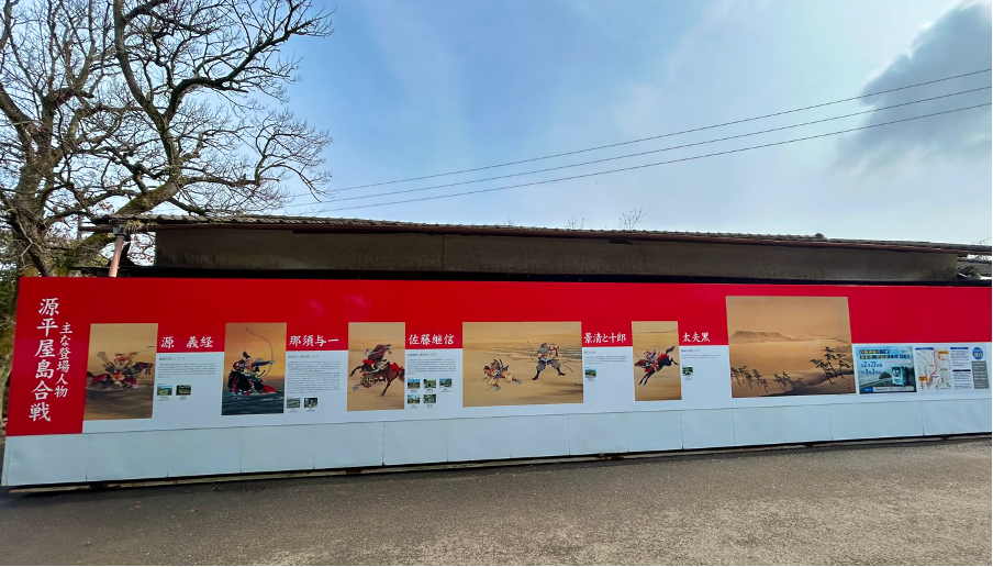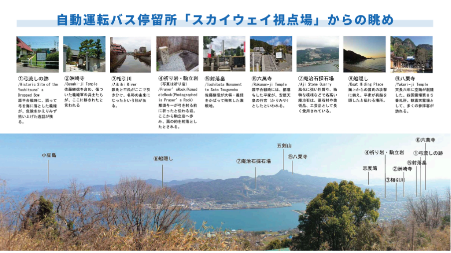 本実証の運行ルートでは、乗車中に、平家物語で描かれる源平屋島合戦の名場面である「義経の弓流し」や「那須与一の扇の的」などの舞台となった景色を一望でき、歴史を楽しむことができます。出発地点の屋島山上観光駐車場には、源平屋島合戦の逸話を紹介するアートパネルが設置されており、事前に当時の歴史について学ぶことができます。折り返し地点であるスカイウェイ視点場では約5分の停車時間を設け、乗客は一時降車して源平合戦古戦場の景観を堪能できます。