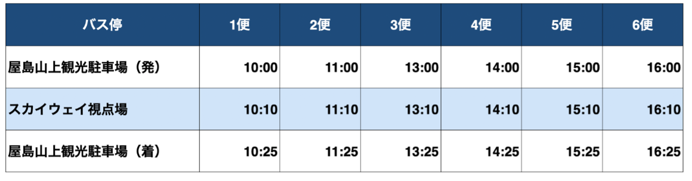 ・屋島⼭上観光駐⾞場を起点にスカイウェイ視点場を折り返し地点とする往復のルートを1日に6便運行します。屋島山上観光駐車場の出発時刻は下記の通りです。