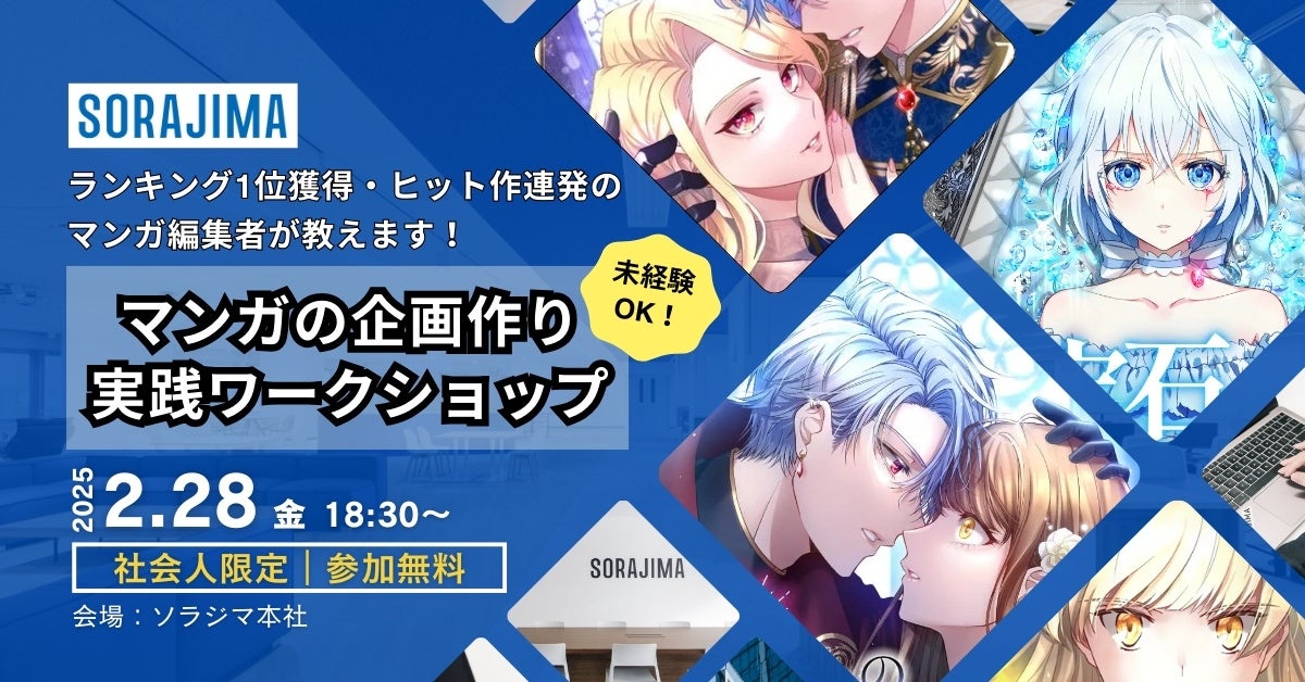 株式会社ソラジマ(代表取締役:萩原鼓十郎・前田儒郎、以下「ソラジマ」)は、2025年2月28日(金)に「マンガの企画作り実践ワークショップ」を開催いたします。当日は大人気Webtoonを次々と生み出している当社の現役漫画編集者が講師となり、仕事の根幹である「企画作り」についてお教えいたします。