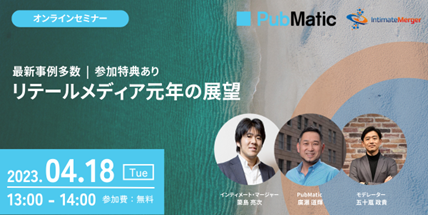 国内最大級パブリックDMPを提供するデータプラットフォームカンパニーの株式会社インティメート・マージャー(本社:東京都港区、代表取締役社長:簗島 亮次、以下当社)は、PubMatic, Inc.(NASDAQ:PUBM、本社:米国カリフォルニア、共同創設者兼CEO:Rajeev Goel、以下、PubMatic)とプログラマティック広告のテクノロジーパートナーの一企業として優先取引契約を締結したことをお知らせします。また、両社のパートナーシップを強化していく取り組みの皮切りに広告主・パブリッシャー企業に向けた共催セミナー「【最新事例多数 | 参加特典あり】リテールメディア元年の展望」を2023年4月18日(火)に開催します。