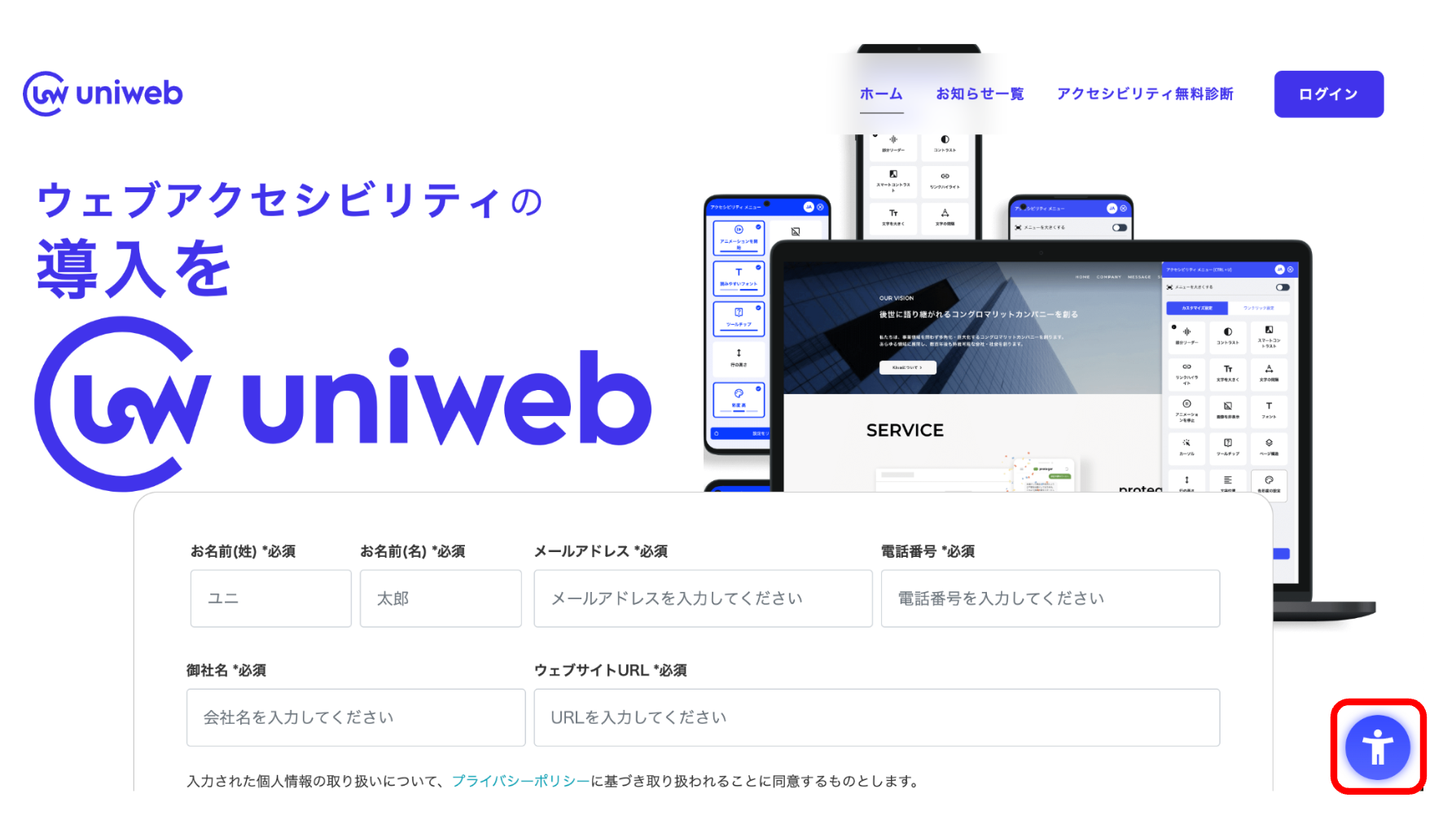 ユニウェブは、すべてのウェブサービスにコード一行を追加するだけで「導入当日」にウェブアクセシビリティ機能をサポートします。