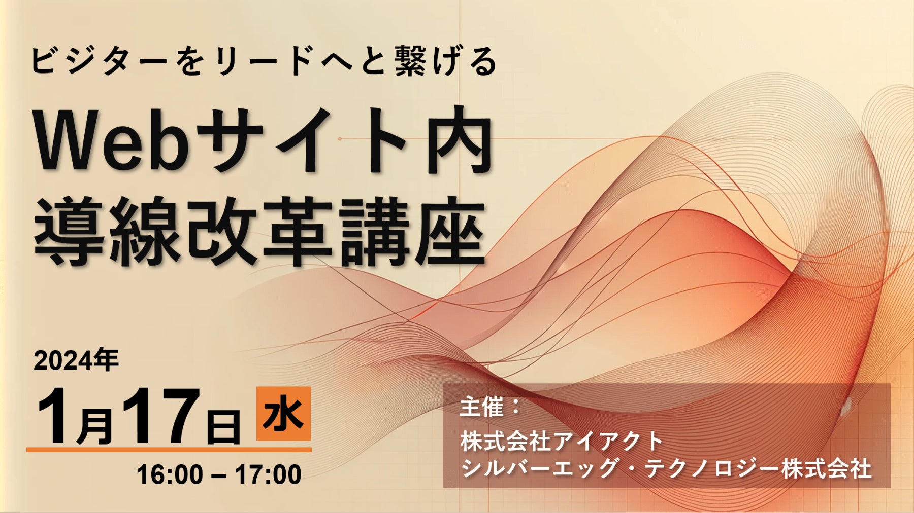 AI技術をベースとしたデジタルマーケティングサービスを提供するシルバーエッグ・テクノロジー株式会社(本社:大阪府吹田市、代表取締役社長&CEO:トーマス・フォーリー、証券コード 3961、以下 シルバーエッグ社)は、2024年1月17日(水)に、Web/システムインテグレーション事業を行う株式会社アイアクト(本社:東京都千代田区、代表取締役社長:笠井 隆義、以下 アイアクト社)と、企業のブランドサイトやサービス情報サイトの企画/運営担当者の皆様を対象としたウェビナー「ビジターをリードへとつなげる Webサイト内導線改革講座」を開催いたします。