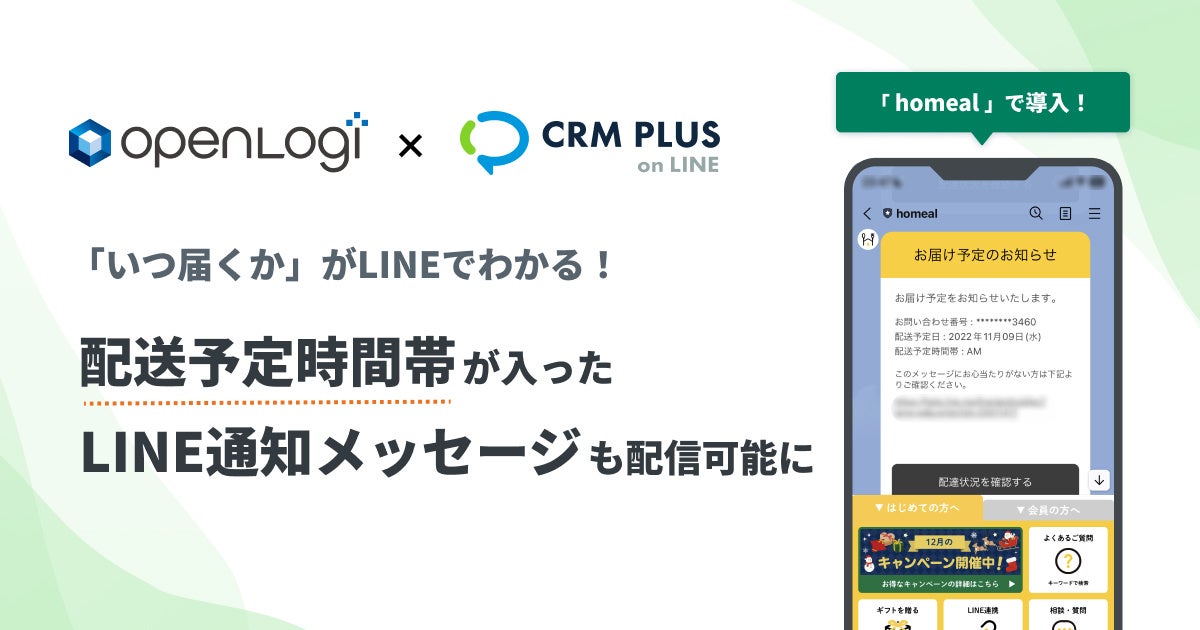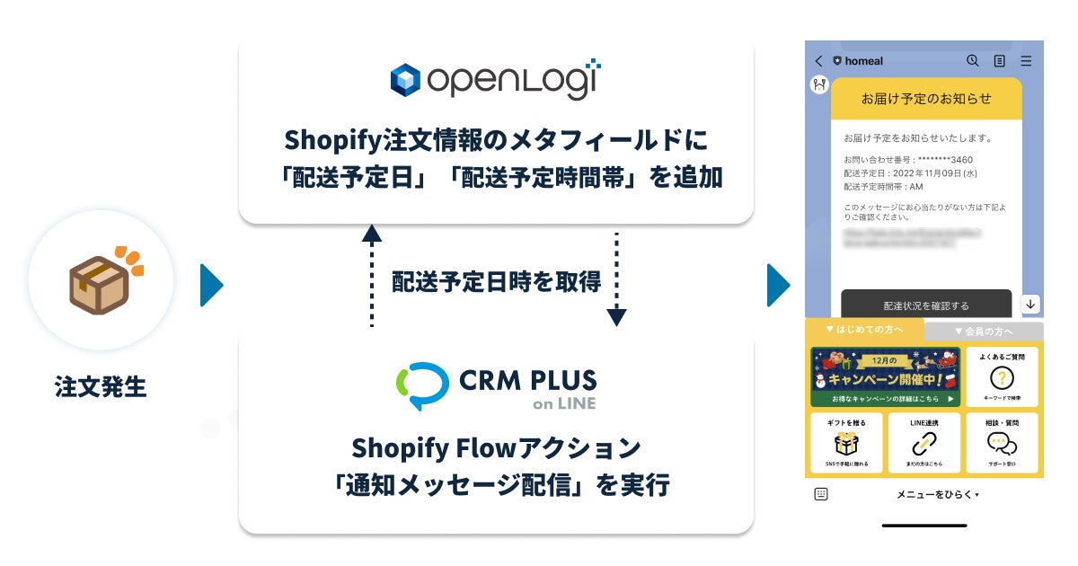 2022年12月21日、Shopify(ショッピファイ)アプリ「CRM PLUS on LINE」(株式会社ソーシャルPLUS、所在地:東京都文京区、代表取締役:岡田 風早)は、株式会社オープンロジ(東京都豊島区、代表取締役:伊藤秀嗣)が提供する物流フルフィルメントプラットフォーム「オープンロジ」との連携で、配送予定日だけでなく配送予定時間帯も記載したLINE通知メッセージ ※1 の配信が可能になったことをお知らせします。