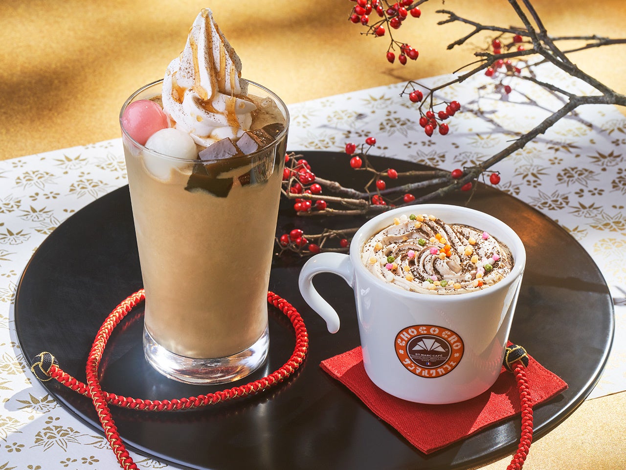 また、紅白白玉をトッピングしたドリンク2種類は、見た目からもお正月のお祝いムードを感じられるようなメニュー。『香ばしほうじ茶寿スムージー~紅白白玉とほうじ茶ゼリー添え~』は、大人な味わいのほうじ茶スムージーに濃厚なソフトクリームやほうじ茶ゼリー、ソースをトッピングすることで、香ばしい香りと甘さの掛け合わせや様々な食感を楽しめるドリンクです。『香ばしほうじ茶きな粉寿ラテ~紅白白玉とほうじ茶あんこ添え~』は、まろやかな口当たりの温かいほうじ茶ラテに、京都産のほうじ茶あんこや紅白白玉をいれており、良くかき混ぜて飲むことでまるでおしるこのような味わいを堪能いただけます。