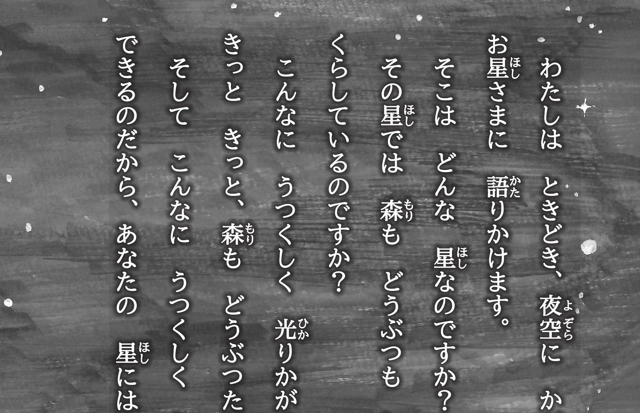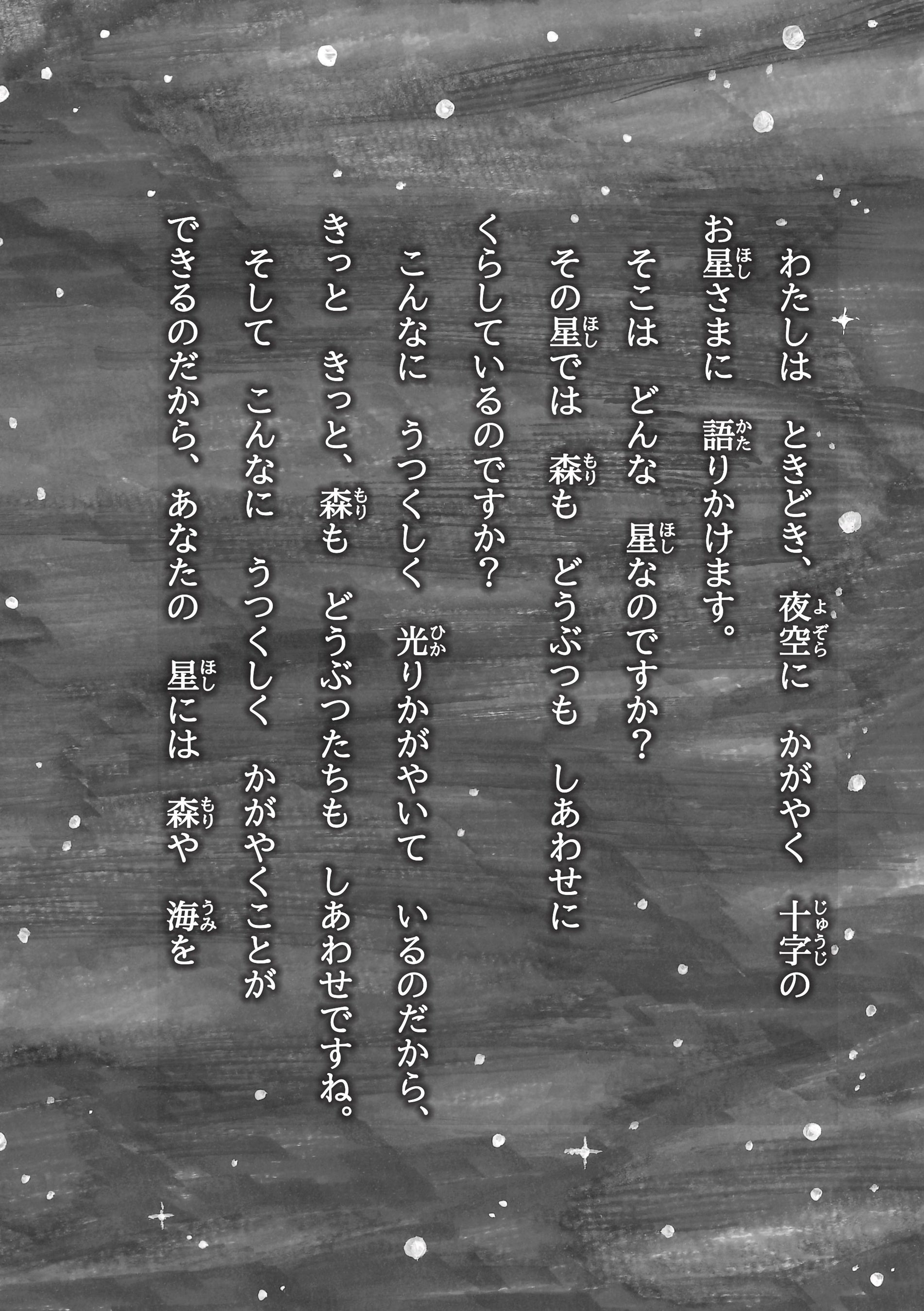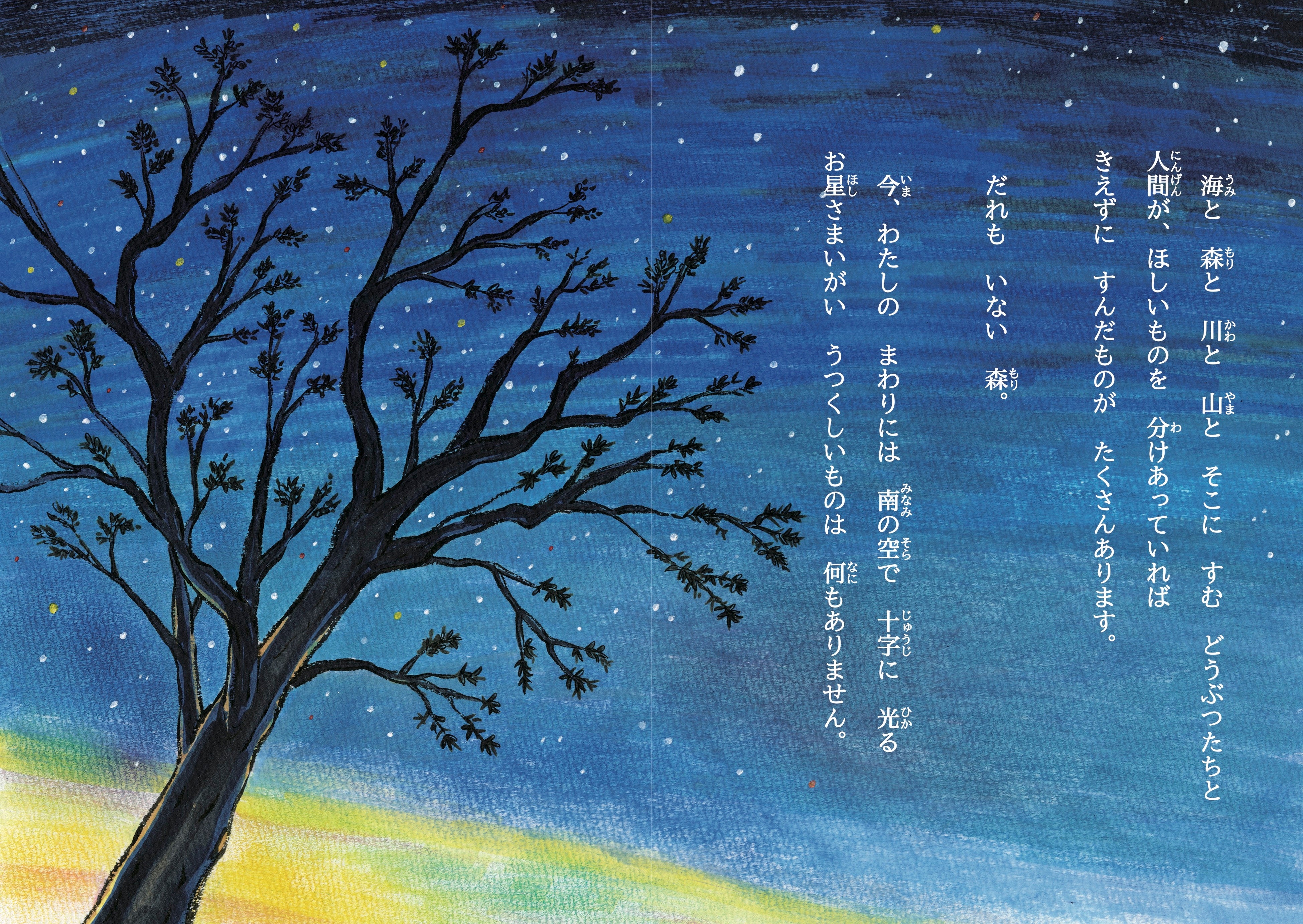 そして、キラキラ輝く地球を取り戻すためには、私たち人間が欲しいものを独り占めせず、海や森や山や動物たちと分け合うことが大切だということを伝えたいと思った。幸せを半分ずつして、誰かを幸せにできれば、結果、自分も幸せになれるのだ。