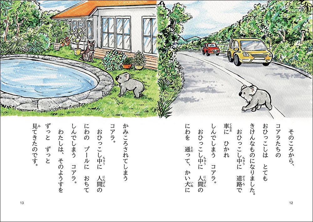 でも、人間が家や道路を作り、森はすがたをかえていきました。ある夜、危険な道路を渡ってコアラが私のところへ引っ越してきました。