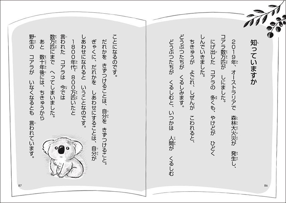 本書は「環境問題」「わけあう気持ち」「野生動物と人との共生」というメッセージを、コアラの創作物語にすることで、小学校低学年でも理解できる内容に仕上げることができた。