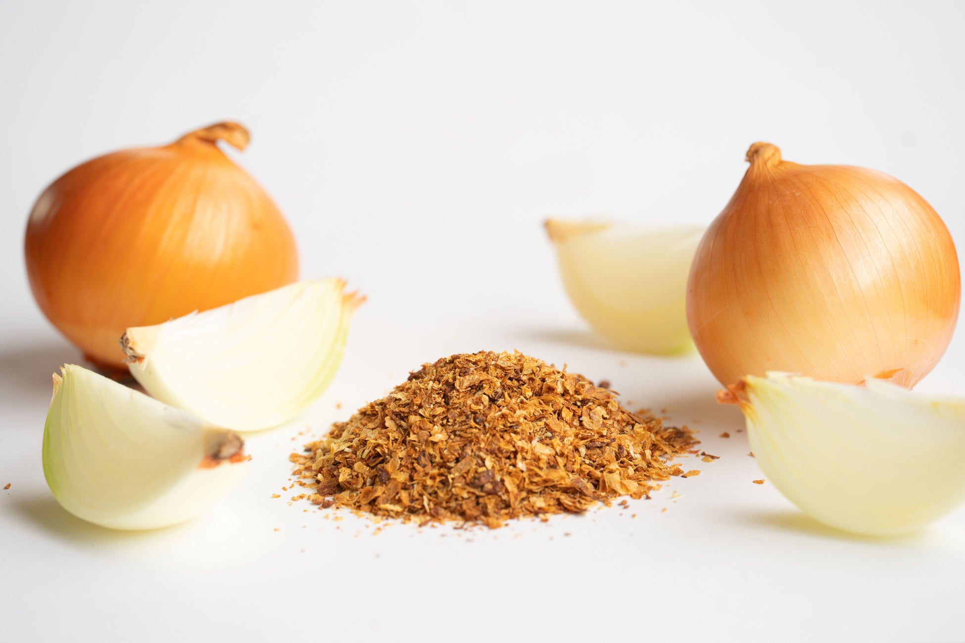 生のタマネギ端材を400℃の加熱水蒸気で焙煎しながら乾燥することで、深い旨味を引き出せる