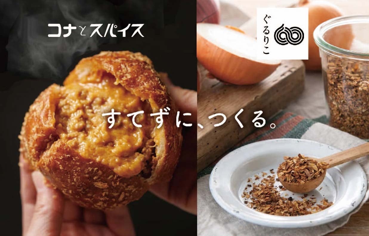 酪農の町・那須を通じて、牛乳の加工過程で生まれるスキムミルクやホエイなどの副産物を利活用し、美味しいスイーツを生み出し続けているGOOD NEWSは、「もったいない」に残されたおいしさを、ギュッと「かおり」に凝縮した新感覚のクラフト調味料である「ぐるりこ」に、共通する想いを感じ、「コナとスパイスのカレーパン」の中身を生の玉ねぎから「タマネギぐるりこ」へ変更することを決定いたしました。