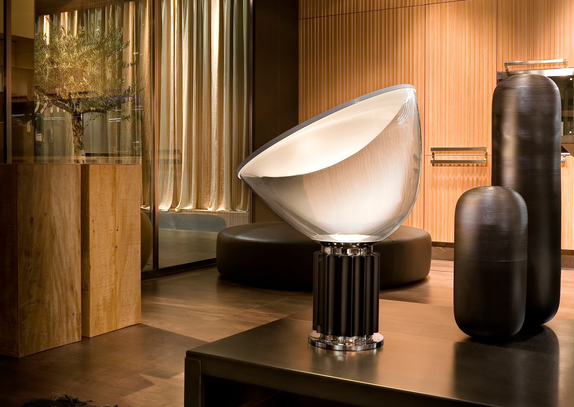 1958年にカスティリオーニ兄弟によってデザインされ、1962年にFLOS が開発・製造。光を反射させる独自の構造で、空間に柔らかな陰影を生み出す。シェード部分の素材はガラスと樹脂の2種展開。調光機能付き。