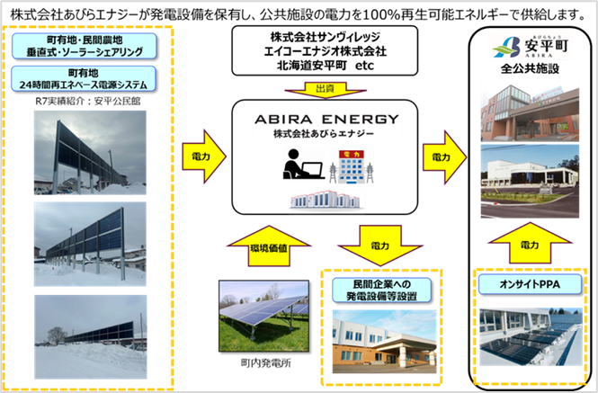 サンヴィレッジグループの一員である「株式会社あびらエナジー」は、北海道安平町および北海道銀行と連携し、再生可能エネルギーの地産地消を目指す「あびら再生可能エネルギー地産地消モデル」事業を開始しました。本事業は、環境省の重点対策加速化事業の採択を受け、2030年までに公共施設の使用電力を100%再生可能エネルギーで賄うことを目標としています。