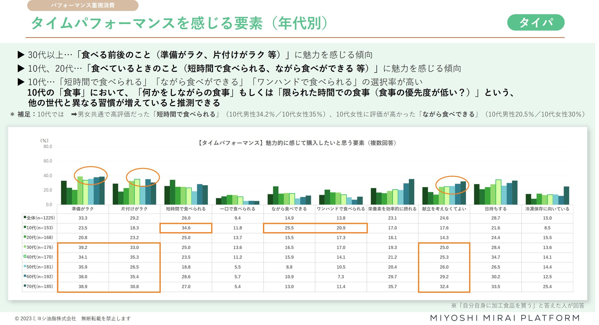値上げや節約を意識しながらも、パフォーマンスを重視して価値があると判断した商品は購入するという消費行動をコスト、タイム、ヘルス、スペースの各パフォーマンスに分けて分析した調査データを掲載しています。例えば、食品に求めるタイムパフォーマンスについては、10・20歳代は「短時間で食べられる」「ながら食べができる」など喫食時のパフォーマンスを重視するのに対し、30歳代以上は「準備が楽」「片付けが楽」など食べる前後のパフォーマンスを重視するといった、ターゲットを定めた商品を考える際に役立つ情報を掲載しています。